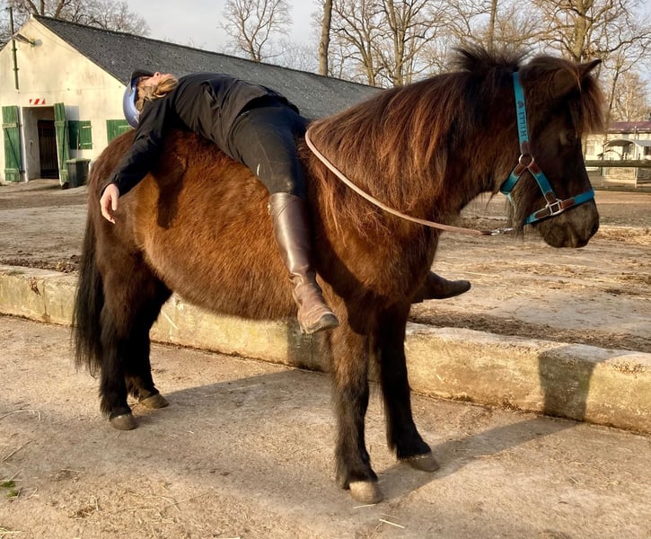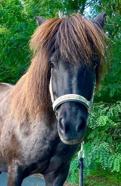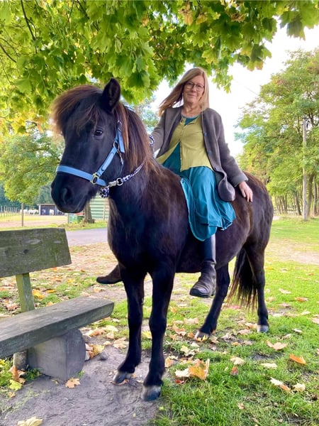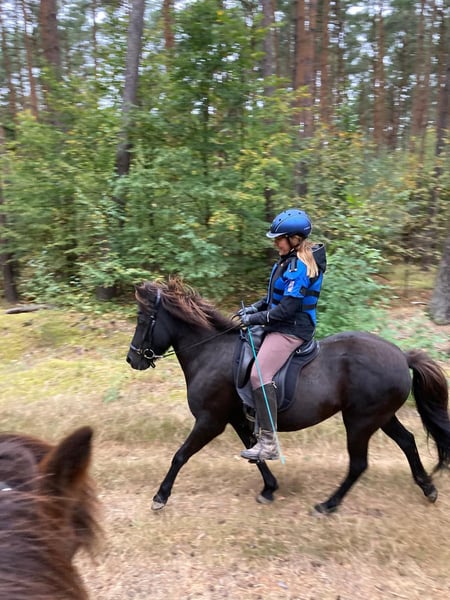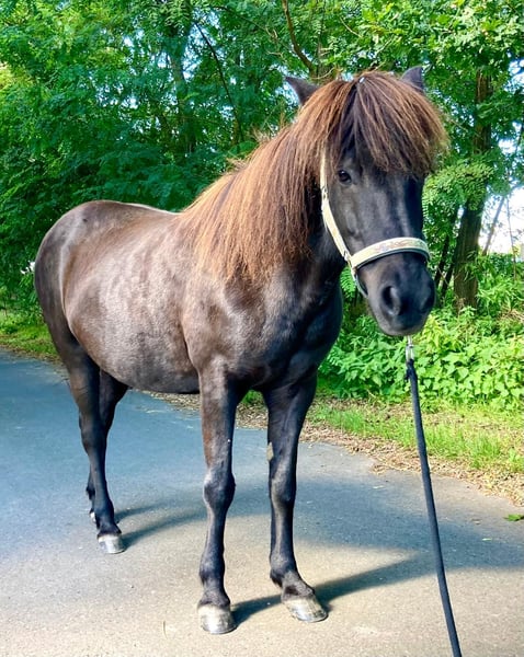 Hylling fra Hafdal - genannt Hylli - ist eine Seele von Pferd. Auf dem Paddock kommt sie einem freundlich entgegen zur Begrüßung. Gelände-Ausritte mit Hylli sind immer entspannt. Sie ist 2009 in Dänemark geboren und ausgebildet worden. Seit 11 Jahren unterm Sattel, ist sie ein erfahrenes ruhiges Freizeit-Reitpferd. Auch als Therapiepferd ist sie geeignet. Sie ist sehr gutmütig und trägt auch Anfänger und Kinder sicher. Ihre volle schwarzbraune Mähne mit goldenen Strähnen ist ein Hingucker. Hylli ist Viergängerin mit leicht abrufbarem Tölt. Sie hat eine angenehme Lauffreude, ist dabei jederzeit gut anzuhalten. Wenn sie einmal Unsicherheiten der Reiterin spürt, bleibt sie stehen, anstatt loszurennen. Hylli ist nicht schreckhaft. Sie kennt Traktor, Hunde, Katzen, Rehe, plötzlich auffliegende Fasane - alles kein Problem. Auch mit Insektenspray lässt sie sich unkompliziert einsprühen. Sie ist gesund, geimpft (Influenza, West-Nil-Virus) und hat routinemäßig zahnärztliche und hufpflegerische Versorgung sowie Wurmkuren erhalten. Sie hatte immer gesunde Hufe und ist derzeit barhuf. Sie ist ekzemfrei. Bis vor 2 Jahren hat sie immer bei der gleichen Familie gelebt und war dort ein verlässliches Kinderpferd. Aus finanziellen Gründen wurde sie abgegeben und fand so ihren Weg zu mir. Sie hat sich in ihrem neuen Zuhause unkompliziert eingelebt. Ich habe mit Hylli zwei schöne Jahre voller entspannter Ausritte erlebt. Seit einigen Monaten kann ich ihr aus gesundheitlichen Gründen zeitlich nicht mehr gerecht werden. Sie ist dadurch etwas rundlich geworden und braucht wieder mehr Bewegung. Es fällt mir nicht leicht, sie abzugeben. Aber diese liebe, kerngesunde Tölterin ist viel zu schade, um nur herumzustehen. Sie wird 17 und ist bei guter Haltung noch lange reitbar. Hylli ist gut sozialverträglich in der Herde. Sie steht mit Stuten und Wallachen, Ponys und Großpferden gemischt (ca. 20 Pferde). Sie ist eher rangniedrig, steht beim Futter ruhig hinten an, geht Ärger aus dem Weg, zeigt aber auch, wenn es ihr gar zu viel wird. Der Pferdehof befindet sich unweit von Berlin in einem herrlichen Ausreitgebiet. Falls Interessent:innen den Einstellplatz vor Ort übernehmen möchten, gebe ich einen guten Preisnachlass. Aber auch in einem neuen Zuhause wird Hylli sich bei guter Haltung unkompliziert eingewöhnen. Auf Wunsch kann ihr Zubehör dazu gekauft werden: Topreiter-Sattel "Start", Topreiter-Trense, Quittpad-Satteldecke, Quittpad - Kurzgurt, alles erst 1-2 Jahre alt. Papiere sind vorhanden. Ich freue mich auf Ihre Nachricht und beantworte gern Fragen. Viele Grüße, Steffi Pfeifer