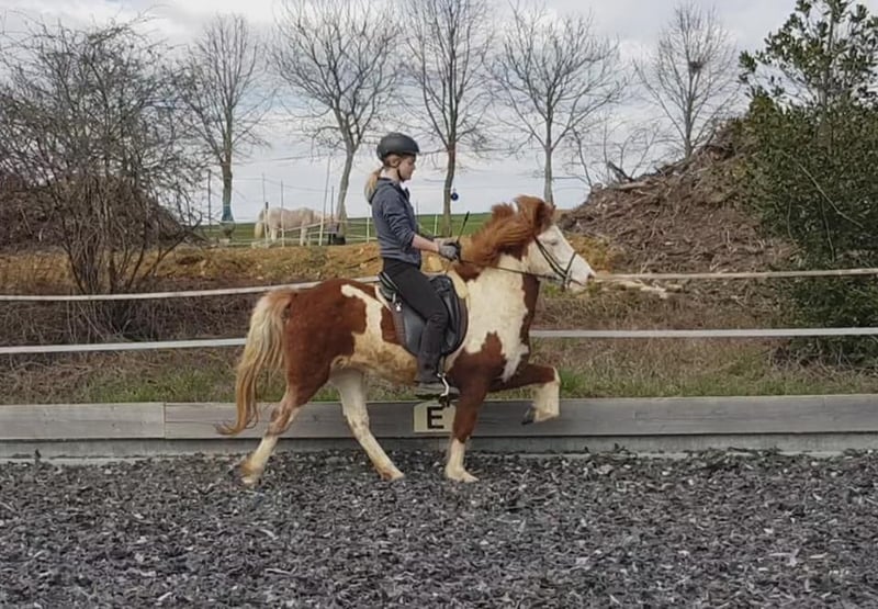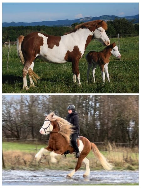 Mósaík was born in 2024 in Germany and is a strikingly marked, tobiano pinto with a white ear. She has excellent bloodlines, her sire is Jaguar fra Teland (1.51 m), and her dam (1.38 m) is by Kvistur frá Skagaströnd. She is still foal at her age but has been regularly dewormed, vaccinated, introduced to the farrier, and is naturally well-supplied with minerals. She is friendly, enjoys cuddling, and will even lie down if you sit beside her for affection. Mósaík is raised appropriately in a herd and is always among the first to approach. She shows a good trot and plenty of tölt, making her not only a promising riding horse for the future but also an interesting candidate for breeding. The photos are current snapshots of her in the herd and with her parents. Videos are not available at this time.