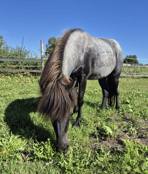 Stella von Godafoss - eine wunderschöne, junge Islandstute mit besonderer Farbe - ein echter Blickfang in seltenem Rapp Farbwechsler (Blue Roan). Geboren 2022 und mit einem geschätzten Endmaß von ca. 140 cm, bringt sie nicht nur eine tolle Optik, sondern auch ein gesundes Gebäude, Gesundheit (Sommerekzem frei) und ein wunderbares Wesen mit. Sie ist rundum gepflegt, regelmäßig tierärztlich untersucht, entwurmt und geimpft. Stella ist schmiede- und verladefromm sowie brav beim Tierarzt - das tägliche Handling ist für sie selbstverständlich. Aufgewachsen im Offenstall in einer Stuten Herde mit viel Sozialkontakt, zeigt sie sich gut sozialisiert, ausgeglichen und freundlich im Umgang mit anderen Pferden. Besonders hervorzuheben ist ihr liebevoller, offener Charakter. Stella ist menschenbezogen, umgänglich, neugierig und lernwillig - ein echtes Verlasspony in der Entwicklung. Sie wächst mit Kindern auf, begegnet ihnen einfühlsam und geduldig und geht bereits als Handpferd zuverlässig mit ins Gelände. Auch bei Spaziergängen mit Kindern zeigt sie sich stets gelassen und aufmerksam. Trense und Longenarbeit kennt sie ebenfalls, wurde aber altersgerecht in Ruhe aufgebaut und durfte sich körperlich und mental entwickeln. Mit ihren guten Grundgangarten und ihrem ausgeglichenen Wesen ist Stella eine ideale Partnerin für Freizeit- und Geländereiter, die ein cooles Jungpferd mit klaren Anlagen zum Selbstausbilden suchen. Sie wird mit Equidenpass und Abstammungsnachweis in fördernde, liebevolle Hände abgegeben - bereit für ihre nächsten Schritte und voller Potenzial für eine gemeinsame Zukunft.