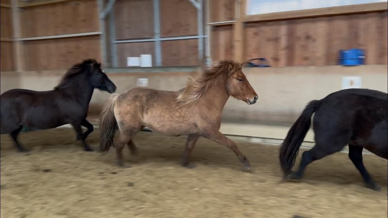 Vif von Möllenbronn is a friendly, five gaited, 3 year old young Fuschfalst mare. She has a very good pedigree. Her sire is LK1 in tölt, five gaits and pass and is himself elite tested. He is a son of Hrannar frá Flugumyri. Vif's dam ran successfully LK2 in sport (V1 and T1) with individual scores up to 7.0 for tölt, walk and trot. Vif is cooperative and friendly to handle. She is very uncomplicated in the herd. She shows all gaits with good ground coverage. Vif is growing up in a herd of young mares. She is regularly vaccinated and wormed. Foal test: Exterior: 7.8 Interior: 7.9 Gaits: 7.9 Overall: 7.87 Judges' verdict: Self-confident, well-built foal with lots of natural tölt and good gait distribution, energetic hindquarters, lots of speed and clear race passages