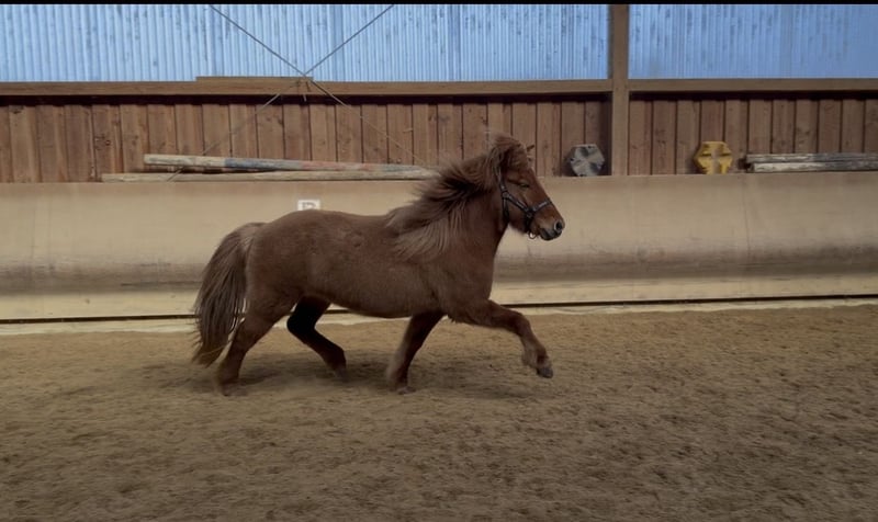 Vif von Möllenbronn ist eine freundliche fünfgängig veranlagte 5jährige junge Fuschfalbstute. Sie hat sehr gute Abstammung. Ihr Vater ist LK1 im Tölt, Fünfgang und Pass und ist selbst Elite geprüft. Er ist ein Hrannar frá Flugumyri Sohn. Vifs Mutter lief erfolgreich LK2 im Sport (V1 und T1) mit einzelnoten bis 7,0 auf Tölt, Schritt und Trab. Vif zeigt sich im Umgang kooperativ und freundlich. Sie ist in der Herde sehr unkompliziert. Freilaufend zeigt sie alle Gänge mit gutem raumgriff. Vif wird gerade angeritten. Sie ist regelmäßig geimpft und entwurmt. Wir können uns Vif später sehr gut als perfekten Freizeitpartner, vielversprechendes Sportpferd oder für die Zucht vorstellen. Fohlenprüfung: Exterieur: 7,8 Interieur: 7,9 Gänge: 7,9 Gesamt: 7,87 Richterspruch: Selbstbewusstes, gut aufgerichtetes Fohlen mit viel Natürtölt und guter Gangverteilung, energisch eingesetzter Hinterhand, viel Tempo und deutlichen Renpassansätzen