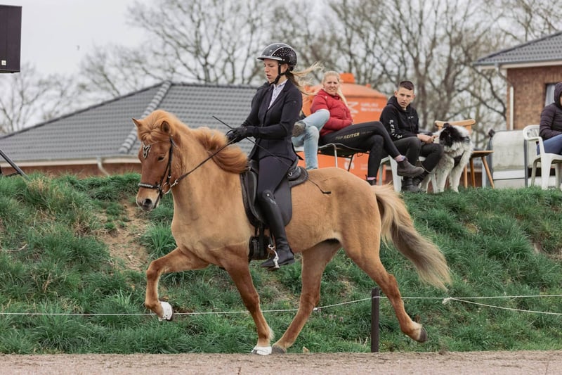 Beschreibung: Hoch talentiere Tölterin mit gutem und sehr einfach zu regulierendem Temperament mit schönen akzentuierten Bewegungen. Sie ist direkt Startklar 5 jährig in den Futurity prüfungen durch zu starten. Exterieur: Blika hat ein sehr gutes Gebäude mit langen Linien. Charakter: Blika ist dem Menschen und allem Anderen immer stets aufgeschlossen. Allem neuen begegnet sie offen und ist sehr unerschrocken. Sie hat immer Lust etwas zu machen und ist die erste die kommt, wenn man in den Paddock geht. Gänge: Blika ist fünfgänig Veranlagt. Der Rennpass wurde schon angetestet, aber auf grund ihres Alters noch nicht weiter trainiert, aber es ist auf jeden Fall viel vorhanden. Sie hat ganz viel leicht zu reitenden immer Taktklaren Tölt mit schönen akzentuierten großrahmigen Bewegungen. Im Tölt hat sie jetzt schon eine hohe Tempofähigkeit und kann auch schon Zügelüberstreichen. Auch ihre Grundgangarten sind schön und lassen sich jeder Zeit in ansprechender Form reiten. Ausbildungsstand: Blika hat ihre Grundausbildung abgeschlossen. Sie steht gut an den Hilfen und kann auf allen Plätzen und im Gelände alleine und in der Gruppe geritten werden. Außerdem ist sie schon ihr erstes Turnier gelaufen. Dort wurde sie im Futurity Viergang und Tölt vorgestellt und absolvierte die Prüfungen gut und unkompliziert. Wer passt zu mir: Aufgrund ihrer Größe eigent sich Blika auch für größere Reiter. Da Blika unerschrocken und unkompliziert ist eigenet sie sich perfekt für eine Jungreiterin die ihr Pferd sucht mit dem sie in den Turniersport einsteigen kann, aber auch im Erwachsenensport kann Blika mithalten. Aufgrund ihreres tollen Charakters können wir uns Blika auch als tolle Freizeitpartnerin vorstellen. einfach ein echter Allrounder. Vater: Außergewöhnlicher Fünfgänger. 3-facher WM-Teilnehmer. Naddur vom Schluensee ist ein großer Fizo-Elite geprüfter Rapphengst, der seine hervorragende Qualität auch schon bei etlichen nationalen wie internationalen Meisterschaften bewiesen hat. 2015 und 2017 startete er auf der Weltmeisterschaft. Aber nicht nur er selbst ist hocherfolgreich im Sport unterwegs gewesen, auch seine Nachzucht kann sich schon mit Meisterehren schmücken (unter anderem die deutsche Meisterin im Töltpreis Náttrun vom Forstwald). Zudem verfügt Naddur über einen außerordentlich freundlichen Charakter, den er seinen Nachkommen mitgibt. Pflegezustand: Blika ist wie alle von Kranichtal gezüchteten Pferde ekzemfrei und aus ekzemfreien Elternlinien. Sonstiges: Sie kann jederzeit besichtigt und probegeritten werden.