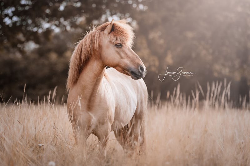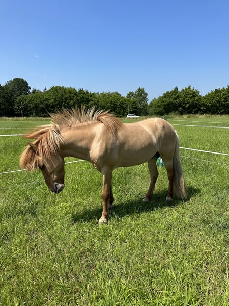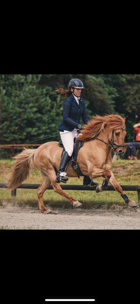 Super schicker Allrounder mit extrem viel Potenzial für den hohen Sport Máni frá Hrafnkelsstödum IS2012136873 Máni ist ein super schicker 1,42m großer Galsi-Enkel, 5-Gänger in schicker Sonderfarbe: Fuchsfalbe mit Stern. Er war bis Ende 2024 Hengst und hat 20 tolle Nachkommen (darunter auch einige Elite Fohlen). Máni ist ein absoluter Allrounder wie er im Bilderbuch steht: - er springt über 1,30m - Futurity Viergang (5-jährig): 6,9 Punkte - FIZO alle Gänge 8,0 (als Viergänger vorgestellt) - er liebt es am langen Zügel durch den Wald zu tölten - immer regulierbar (kein Anfängerpferd!) Máni kann ohne Probleme, sowohl vorne als auch hinten im Gelände laufen. Er kennt sämtliche Dressurlektionen und steht sehr leicht an den Hilfen. Durch meine Schwangerschaft bin ich leider zu schwer für ihn geworden und letztendlich war er immer etwas zu klein für mich (ich bin ca 1,90m). Ich kann mir Máni sehr gut für einen gut reitenden Jugendlichen/ Junioren vorstellen, der noch einige Preise auf dem Turnier holen möchte oder vor hat mal bei der DJIM teilnehmen zu wollen. Seine Bestpunktzahl liegt bei 7,0 im Tölt, Galopp und Trab, und bei 6,5 für Schritt. Er war auch schon mal F1 qualifiziert, allerdings ist der Pass manchmal etwas viertaktig, daher sehe ich sein Potenzial eher in der V1 und T1. Aber auch als Luxusfreizeitpferd wäre er perfekt. Máni hat gutes Temperament, ist immer fleißig und liebt es bewegt/ gearbeitet zu werden. Máni ist regelmäßig (fürs Turnier) geimpft, entwurmt, dem Hufschmied, Osteo und Zahnarzt vorgestellt worden. Er ist aktuell untrainiert, da ich schwanger war. Trainiert steigt der Preis Standort: 49832 Thuine