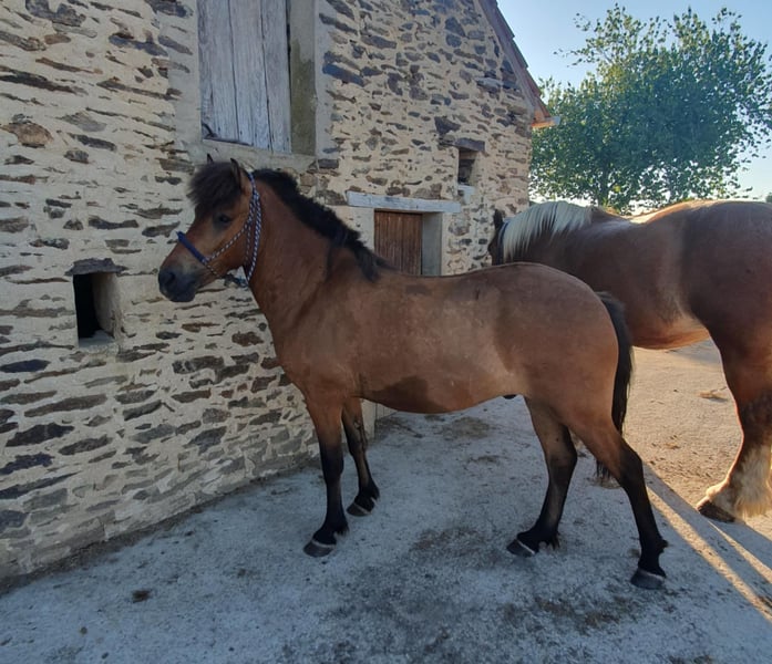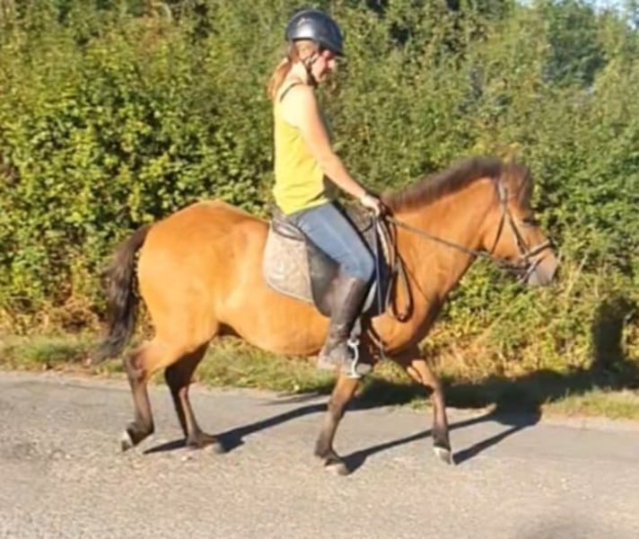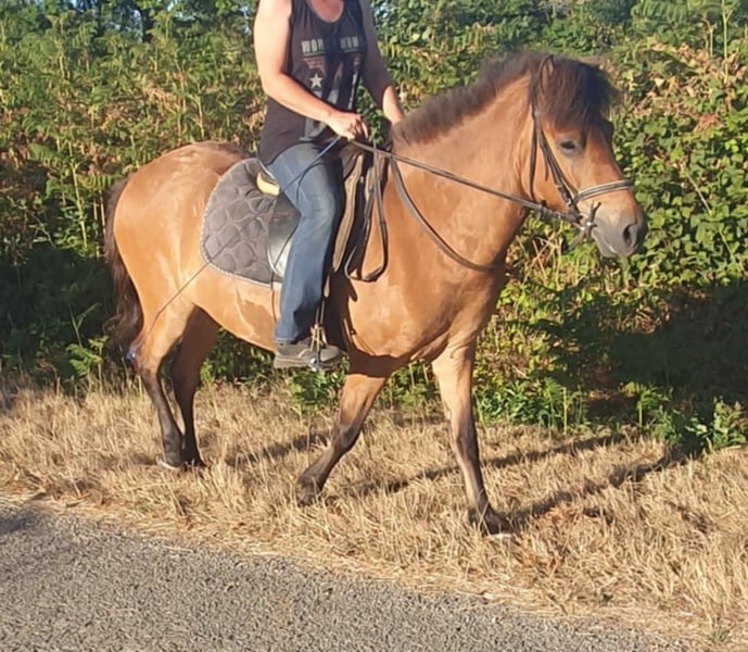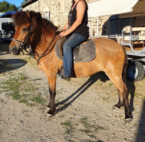 LANDFARI DE CHAPON Islandais, Hongre, Bai, né(e) en 2021 Père: FREKUR DU DON Islandais Mère: NINA ERLENHOF Islandais Hongre islandais né en France en 2021, Pleins Papiers. Toise 1m40, porteur et solide. Il n'a pas de dermite (s'est arraché tout les crins cet hiver, mais cela repousse tranquillement), ne se gratte pas. Landfari est fraichement débourré, il à fais une quinzaine de petites sorties en extérieur. Vert dans le travail, il accepte le cavalier sans problème, passe devant en balade, ou reste derrière si on lui demande. Il à beaucoup de tolt (au pré et monté), le galop reste encore à travailler. Il a un pas sur et dynamique, courageux et volontaire, il n'est pas peureux et connais la circulation. Il reste néanmoins un jeune cheval qui a encore des choses à apprendre. Facile aux soins et dans la vie quotidienne, il vient naturellement au pré et recherche le contact avec l'humain, aime que l'on s'occupe de lui. Donne bien les pieds, paré régulièrement, voyage bien. Fera un futur compagnon de loisir très sympathique !! (.4..8....0...0 ... ) videos pour personne réellement intéressée.