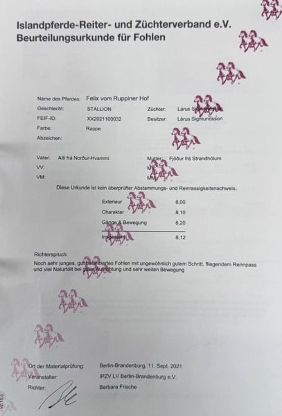 Exceptional Icelandic gelding with impressive presence and great potential Felix is a promising four-year-old Icelandic gelding, already distinguished by his outstanding appearance and noble demeanor. He impresses with above-average size, excellent posture, and a charisma that draws every eye. Felix is sensitive, responsive, and eager to learn—a temperament that, in experienced hands, can develop into a true partner for sport or, naturally, for the ambitious leisure rider. His beautiful, clearly defined basic gaits and natural go indicate significant potential for a successful sporting career. He is currently unbroken, and I am just beginning to start him under saddle. Felix is familiar with all essential daily routines and always remains attentive, fearless, and cooperative. He has already gained initial experience at the lunge and double-lunge and demonstrates good balance and a fine body awareness. He is also accustomed to walks and rider weight. A young gelding for connoisseurs and riders with high expectations— with the right training, he will develop into an exceptional competition or luxury riding horse. Currently, Felix has been brought in for professional backing; he is doing very well and is very sweet, without any vices.