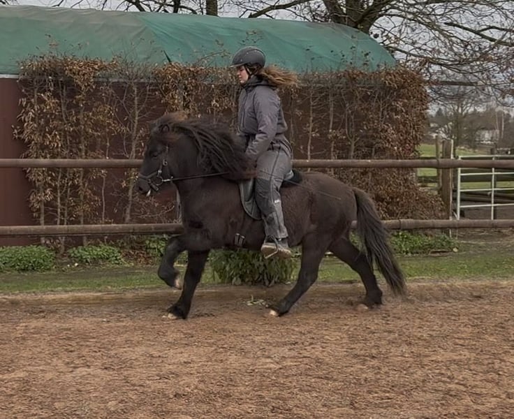 Apollo von Möllenbronn ist ein sehr freundlicher und sympathischer 5jähriger etwas kleiner Viergangwallach. Apollo ist angeritten, zeigte sich dabei sehr motiviert und lernt schnell. Er war bisher beim Anreiten immer wirklich brav und kennt schon Sattel, Trense, Reiter und wird aktuell in den Grundgangarten in der Halle und auf dem Reitplatz geritten. Er hat sehr viel Tempovarianz im Trab mit weiten Bewegungen. Tölt zeigt er immer wieder im Übergang. Er steht aktuell in einer gemischten Herde und ist dort und auch im Umgang sehr unkompliziert. Apollo ist regelmäßig geimpft und entwurmt und gesund. Sein Vater ist Glæsir von der Igelsburg (FIZO: 8,11) und seine Mutter ist eine Vidalin frá Hamraholi (FIZO: 8,4) Tochter.