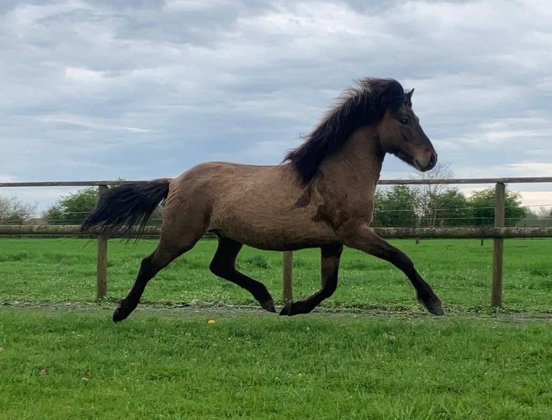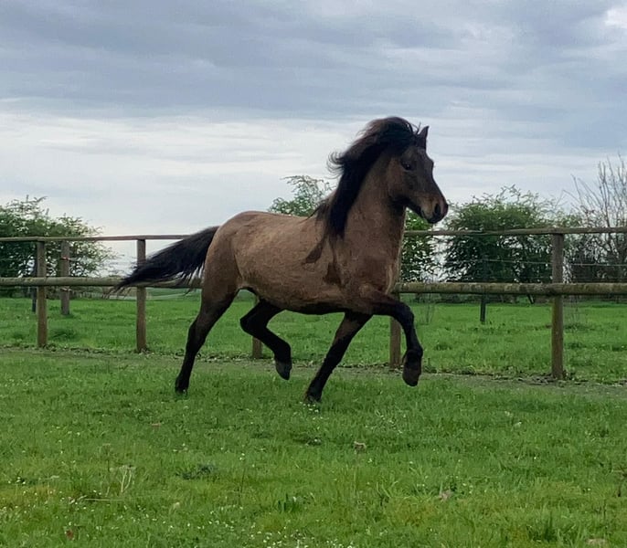 Giovane stallone forte e molto ben sviluppato Giovane stallone sicuro di sé, molto ben sviluppato e ai blocchi di partenza per un ulteriore addestramento. Mostra andature molto vivaci ed espressive quando corre in libertà, con un'ottima azione degli anteriori e un'abbondante spinta dei posteriori.