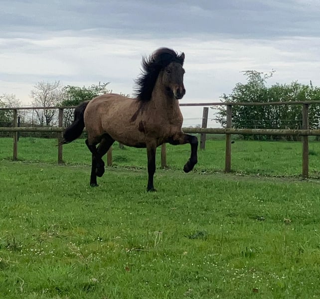 Jeune étalon vigoureux et très bien développé Jeune étalon sûr de lui, très bien développé, qui est dans les starting-blocks pour poursuivre sa formation. En liberté, il présente des allures très énergiques et expressives, avec une très bonne action de l'avant-main et beaucoup de poussée de l'arrière-main.