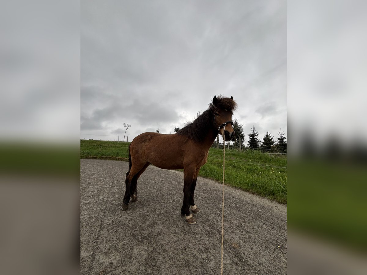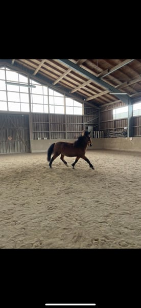 Aron vom Dreisbach DE2019163138 15.06.2019 M: Nótt-Stjarna vom Ökoland Rose V: Óðinn vom Habichtswald - Fünfgänger - schmiede- und verladefromm - regelmäßig geimpft und entwurmt - regelmäßig Pysio + Osteo + Zahnarzt (keine Auffälligkeiten) - 1,44m - Verkehrssicher - Beschlagen Aron ist ein außerordentlich motivierter, hübscher und selbstbewusster junger Wallach mit guter Gangtrennung und mittlerem bis hohem Temperament. Er ist elegant und sportlich gebaut. Er wurde schonend angeritten. Er reagiert sensibel auf Sitz und Hilfen, brauch aber aufgrund seines Ausbildungsstand und Selbstbewusstsein mehr Kontinuität. Aron kennt Bodenarbeit wie Longieren, Doppellonge, Spaziergänge sowie Handpferdereiten. Außerdem kennt er die Halle, Ovalbahn sowie das Gelände alleine oder in einer Gruppe. Im Gelände sowie auch allgemein ist er mutig und nicht schreckhaft. Er ist fünfgängig, die Grundgangarten sind taktklar und bequem zu sitzen, Tölt und Pass sind noch nicht ausgebildet. Er hat jedoch viel Tölt und zeigt diesen auch in den Übergängen. Galopp auf dem Zirkel möglich. In der Herde hat er einen mittleren Rang und spielt mit allen viel und sehr gerne. Er steht mometan in einem Offenstall in einer reinen Wallachgruppe. Er verträgt Heu sowie Heulage. Aufgrund von Alter und Ausbildungsstand nicht für Anfänger geeignet. Sein Zubehör kann gerne mit erworben werden, wenn gewünscht. Melde dich gerne bei mir und wir machen einen Termin zum Probereiten / Kennenlernen aus. Platz vor Preis.