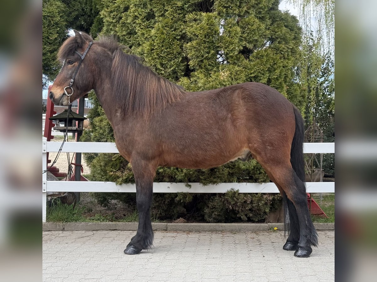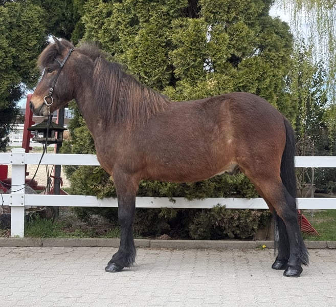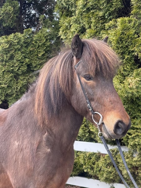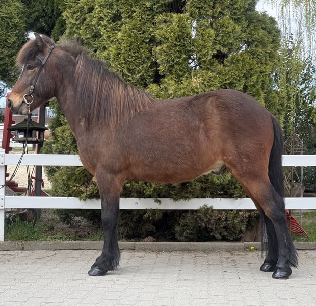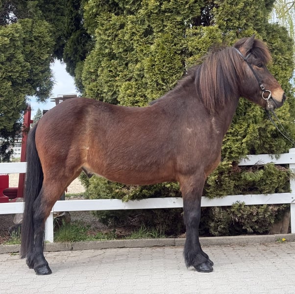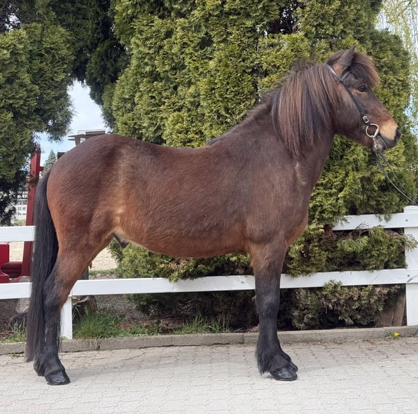 Mímir vom Barghof Wallach, 1,44m groß *2018 in Deutschland Brauner ohne Abzeichen viergängig geritten direkt vom Züchter✅ gesund, beschlagen, ekzemfrei✅ V: Maríus vom Blocksberg 2 VV: Herjólfur frá Ragnheiðarstöðum M: Litfríð vom Barghof MV: Stormur von Faxaból Wie beschreibt man am besten ein ziemlich tolles Pferd, ohne dass es übertrieben klingt?! 😅 Mímir ist einfach ein Traum, charakterlich, gangtechnisch, als auch optisch. Er lässt wirklich keine Wünsche offen. Mit seinen 1,44m zählt er zu den Größeren seiner Rasse und deckt somit alle Reiter sehr gut ab. Viergängig geritten zeigt er sehr viel Talent und ansprechende Bewegung im Tölt. Dabei ist Tölt so einfach zu reiten, dass auch weniger erfahrene Reiter, diesen abrufen können. Trab ist sicher, taktklar und von guter Qualität. Galopp ist gut gesprungen, schön zu sitzen und in allen Tempi zu reiten. Mit einem sanften „Hooo“ lässt er sich bremsen oder gar ganz zum Halt durchparieren. Er zeigt ein großes Talent auch für Dressurlektionen und -Prüfungen. Im Gelände ist er die sichere Bank und lässt sich weder von Straßenverkehr, Kühen, Fahrrädern oder neuen Situationen beeindrucken. Wir sehen ihn als einen absoluten Allrounder für jung und alt, für erfahren und weniger erfahrene, für Freizeit und Sport. Mímir ist ein Pferd, welches man einfach im Stall haben sollte - so finden wir. 🤗 Aufsteigen und sofort wohlfühlen ist bei ihm das Motto!
