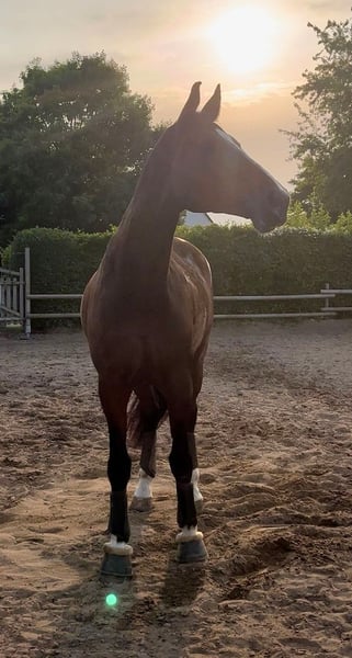 I am looking for a new home for my Italian gelding. He was born in 2008, stands 180 cm tall, and is a very friendly and reliable partner. Due to personal reasons, I no longer have the time to give him the attention he deserves. Therefore, I am seeking a new owner for Chianti, where he can stay forever. He is trained up to L-level dressage and jumping, with competition placements. He has also gained experience in eventing and is dependable and fearless in the cross-country phase. He approaches groundwork and pole work with great enthusiasm. Chianti is easy-going and open-minded when interacting with other horses. He is always looking for a playmate, so I would prefer herd life for him. He is familiar with both pasture turnout and stable living. I purchased him at age 10 with mild shivering and a hypoplastic soft palate. Both issues have been veterinary-checked and he has been successfully competing since then. With plenty of movement opportunities and a large box stall, the shivering is now hardly noticeable. This summer, Chianti sustained an injury to his right front suspensory ligament. The injury has healed well, and he is back in training.