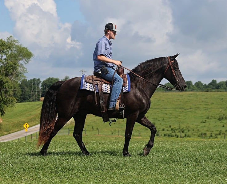 ONLINE AUCTION Place your bids at www.PlatinumEquineAuction.com Starting Bid $3500 Auction ends June 23rd, 2024 Need a new saddle? Check out White Rock Saddles on our website or Facebook! Dodge is a SUPER STOUT built 15.1hh, 10 yr old, Black Gelding and man oh man isn’t he a sharp looker? With that jet black color, he is dressed for a night out on the town, WOW he is a looker! I bought Dodge from some local folks who had owned him for 4 years. He has been trail ridden in several states, been ridden downt he highways and though town. Hes even been tied up at the hitching post at the local store while they went inside. Dodge has a natural 4-beat gait that is very smooth at all speeds for any rider. He has been ridden around farm equipment, ATV’s, and around noisy tarps. On the trails he is always great! Dodge has been exposed to all kinds of wildlife such as deer or turkey or other animals like cows or dogs and will go anywhere that he is asked too. He has been rode many miles in the mountains of Eastern Kentucky and encountered every obstacle possible on the trail. He will go up or down even the steepest slopes, across deep creeks, over downed trees, and over all types of rough terrain while still being sure footed. He has been rode in traffic, and is very traffic safe around cars, semi, log, and dump trucks. He has a great personality and a great attitude about whatever he is asked to do. Feel free to call Trevor Patrick 606-516-8069 with any questions. Located in Parkers Lake, KY. ONLINE AUCTION Place your bids at www.PlatinumEquineAuction.com Starting Bid $3500 Auction ends June 23rd, 2024 Need a new saddle? Check out White Rock Saddles on our website or Facebook!