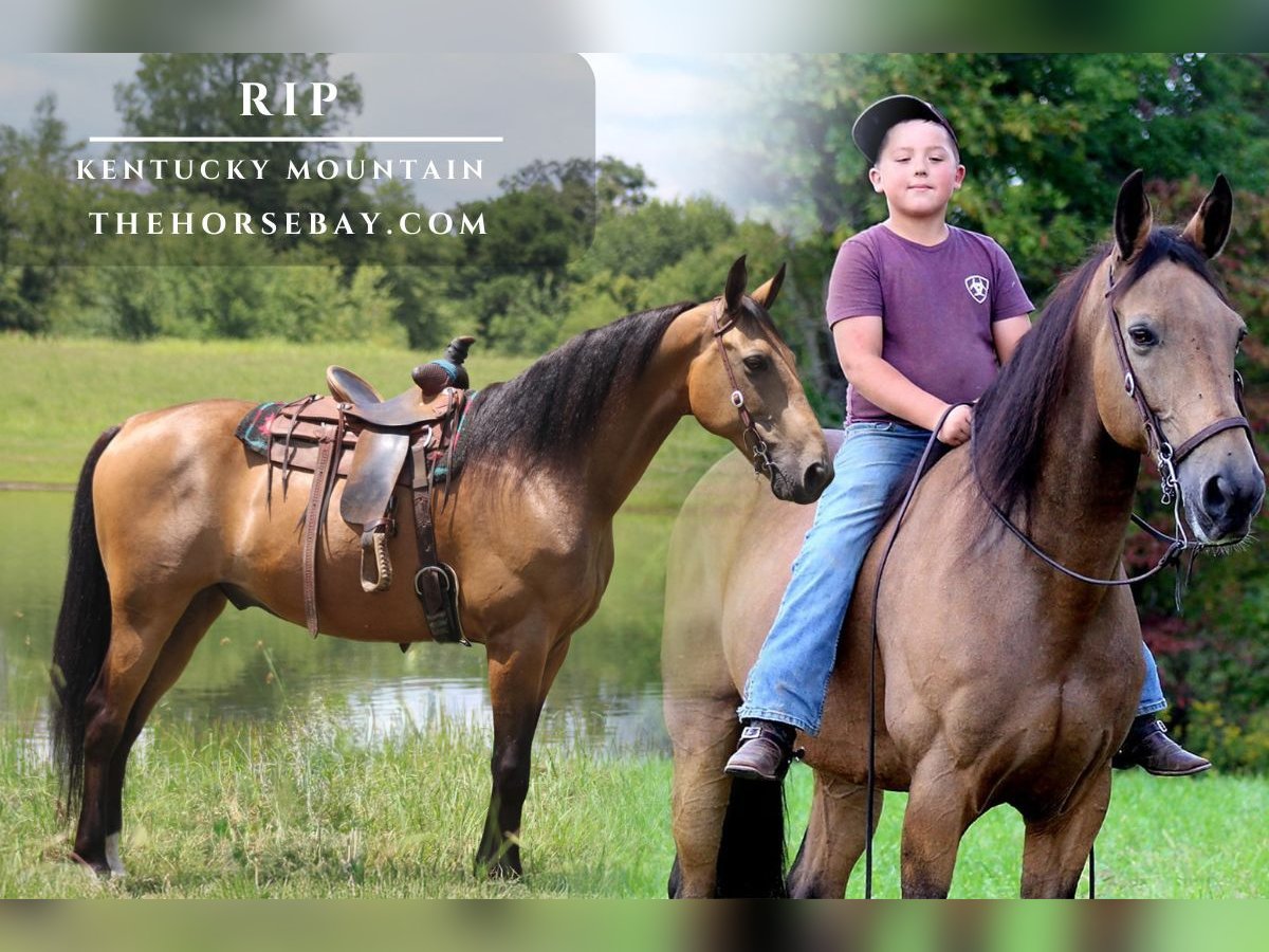 Rip is a beautiful 11-year-old KY mountain buckskin gelding. Standing at 15.1 hands tall. He’s the total package- well-mannered, dependable, and has the looks! He’s built to last, with a heart and mind of a true trail partner. Rip has plenty of experience on the trails and will go wherever you point him- through water, over logs, up or down steep hills. He’s surefooted, confident, and never in a hurry unless you ask him to move out. Rip rides out alone or in a group, leads or follows without issue, and isn’t bothered by traffic, dogs, or wildlife. On the ground, Rip is gentle and respectful- easy to catch, saddle, bridle, load, and stands quietly for mounting, farrier, and grooming. He has a kind eye, a good brain, and a steady personality that makes him enjoyable for just about anybody in the family. If you’re looking for a safe, seasoned trail partner with a willing heart, Rip is your guy!