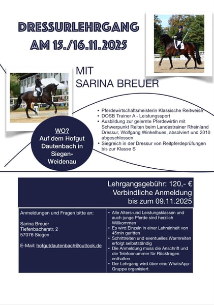 Am 15. + 16.11.2025 findet auf dem Hofgut Dautenbach in Siegen ein 2 tägiger Lehrgang unter der Leitung von Pferdewirtschaftsmeisterin Sarina Breuer statt. Sarina Breuer ist selbst siegreich von Reitpferdeprüfungen bis zur schweren Klasse und im Besitz der DOSB Trainerlizenz A Leistungssport. Boxen können gegen Aufpreis dazu gebucht werden.