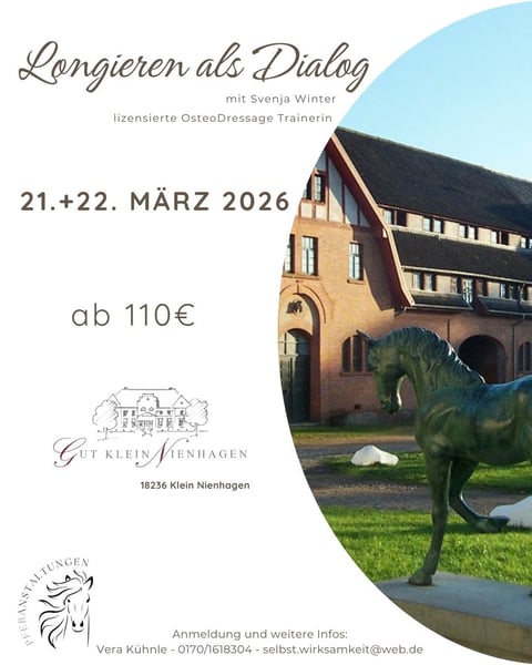 Die sinnvolle Gymnastizierung des Pferdes ist in aller Munde – ob mit oder ohne Reiter. Die lizensierte OsteoDressage-Trainerin Svenja Winter gibt im März 2026 einen 1½-tägigen Workshop auf der wunderschönen Anlage des Gutes Klein Nienhagen. Svenja unterrichtet mit Leidenschaft Pferd und Reiter im Handwerk des Longierens. Ihr Augenmerk liegt auf klug kombinierten Übungsreihen, die für das Pferd ein sinnvolles Ganzkörpertraining darstellen. Mit liebevollem Geschick leitet sie die Longierenden durch die Übungsaufgaben und gibt hilfreiche Hinweise zur eigenen Körperhaltung, -drehung und zur Einhaltung der korrekten Laufwege. Erstmalig findet der bereits bewährte Workshop auf Gut Klein Nienhagen statt. Hier stehen nach Rückfrage in begrenztem Umfang auch Leihpferde zur Verfügung. Für Teilnehmerinnen besteht außerdem die Möglichkeit, direkt vor Ort auf dem Gut zu übernachten – ein Zimmerkontingent ist reserviert. Dieser Workshop ist für Dich geeignet, wenn Du Dir für Dein Pferd ein sinnvolles Ganzkörpertraining wünschst, das folgende Aspekte vereint: Muskel- und Faszientraining, Förderung von Beweglichkeit und Stabilität, Stärkung der ventralen und dorsalen Muskelkette sowie Biegung und Geradeaus. Du bist neu oder hast noch wenig Erfahrung im Longieren? Auch dann bist Du bei Svenja an der richtigen Adresse. Mit Charme und Bestimmtheit führt sie Dich in die Grundlagen des gymnastizierenden Longierens ein. Denn stimmt die Basis, kommt der Rest fast von allein. Wie alle Pferanstaltungen findet auch dieser Workshop in kleinem Rahmen mit begrenzter Teilnehmerzahl statt, um in entspannter und persönlicher Atmosphäre zu lernen und sich auszutauschen. Maximaler Input ist gesichert: Die Teilnahmegebühr enthält den vorbereitenden Theorievortrag, die Möglichkeit jederzeit Fragen an Svenja zu stellen, Aha-Effekte während der Einheiten, die Nutzung der schönen Location, Heißgetränke und eine Pausenverpflegung. Bei Teilnahme mit Pferd bekommst Du drei Einzeleinheiten, in denen Svenja individuell und mit viel Ruhe auf Dich und Dein Pferd eingeht. Sichere Dir jetzt einen der begehrten Plätze! Teilnahme ohne Pferd 110€ Teilnahme mit eigenem Pferd 310€ zzgl. Unterbringung Teilnahme mit Leihpferd 340€