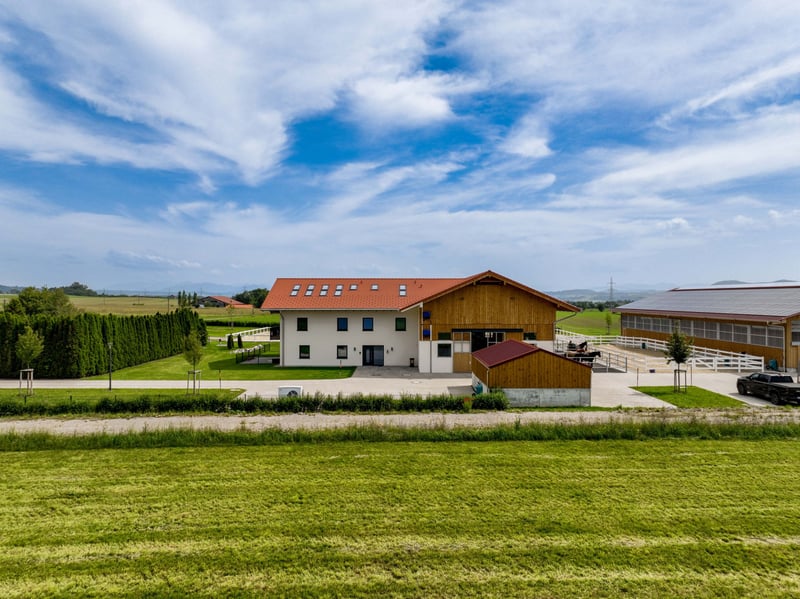 Exclusive Equestrian Facility with Multi-Family House in the Allgäu The property is located in the Oberallgäu district with a sensational view of the Allgäu Alps. The exclusive and high-quality equipped equestrian facility offers a unique combination of a modern equestrian property with optimal living options on site. The facility consists of a stable complex with a total of six paddock boxes, an indoor riding arena of approximately 800 m², a spacious outdoor riding arena, and a winter sand arena. The horses have ample turnout on the approximately three-hectare pasture area. The stables include a wash box, a hay storage area, and tack rooms. The offer is completed by the adjacent residential building, which is directly accessible from the stables. Three apartments and one studio impress with modern amenities, underfloor heating, luxurious bathrooms, and exclusive custom kitchens. The outdoor area features sufficient parking spaces for vehicles, a manure pit with a paved access road, as well as an idyllic, spacious garden area with a garden house. The equestrian facility is available for occupancy by arrangement. A viewing can be scheduled at any time. Further information available upon request. +49 1717408444 ---------- Equestrian Facility Features: • 6 paddock boxes • Outdoor riding arena • Winter sand arena • 40-meter indoor riding arena • Wash box • Hay storage with crane system • Tack rooms • Pasture areas