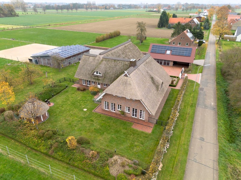 Ein Refugium im Mindener Westen: Zwischen den weitläufigen Wiesen des Mindener Westens öffnet sich hinter einem zweiflügeligen Schmiedeeisentor ein privates Refugium, das man in dieser Form nur äußerst selten findet. Auf einem beeindruckenden Areal von rund 25.690 m² erhebt sich ein mit Reet gedecktes Anwesenensemble, das Ruhe, Naturverbundenheit und architektonische Individualität auf außergewöhnliche Weise vereint. Ein Anwesen wie ein eigener Kosmos. Nach Passieren der elektrischen Zufahrt gelangt man in einen geschützten Innenhof, der von mehreren Gebäudevolumen eingerahmt wird: dem Hauptgebäude, einer reetgedeckten Scheune sowie ergänzenden Funktionsbereichen. Bereits hier wird die besondere Atmosphäre spürbar – großzügig, privat, vollkommen abgeschirmt und geprägt von traditionellen Baustoffen, die sich harmonisch in die Umgebung einfügen. Das Haupthaus eröffnet eine Wohnfläche von ca. 405 m², während eine eigenständige Einliegerwohnung zusätzlich rund 56 m² beisteuert. Charakteristisch für das Wohnkonzept sind klare Sichtachsen, repräsentative Raumhöhen und der direkte Bezug zur umgebenden Natur. Von der Diele aus entfaltet sich das Erdgeschoss: ein weitläufiger Wohn- und Essbereich mit Blick über die Wiesenlandschaft, eine gemütliche Wohnküche, ein Gästezimmer, ein Elternschlafbereich mit Ankleide sowie helle Aufenthaltsräume mit klassischen Sprossenfenstern. Landhausarchitektur in ihrer schönsten Form. Die Wohnräume sind durchgängig geprägt von großzügigen Türen, Holzsprossenfenstern und besonders angenehmen Lichtstimmungen. Mehrere Terrassen schaffen Rückzugsorte für jede Tageszeit – während ein Pavillon mit Reetdach im Garten als zusätzlicher Ruhepol dient. Im Sommer spielt sich das Leben auf den unterschiedlich positionierten Außenbereichen ab; an kühleren Tagen laden zwei Kamine zu wohliger Atmosphäre ein. Privatsphäre auf mehreren Ebenen: Im Obergeschoss öffnet sich zunächst eine Galerie mit Blick in den Wohnbereich. Mehrere Zimmer – ideal als Kinder-, Gäste- oder Arbeitsräume – sowie die Option, zusätzliche ca. 57 m² auszubauen, schaffen Flexibilität für zukünftige Lebenssituationen. Die Einliegerwohnung kann separat oder über das Haupthaus erreicht werden und eignet sich perfekt für Gäste, Au-Pair oder Homeoffice. Technik & nachhaltige Energieversorgung: Die Eigentümer investierten kontinuierlich in die Modernisierung des Anwesens. Dazu zählen unter anderem: - Photovoltaikanlage (ca. 21 kWp, Baujahr 2013) - moderne Pelletsystem-Heizung ( 2013) - Fußbodenheizung im Erdgeschoss - hochwertige Holzfenster, 2017 neu lackiert - maßgefertigte Tischlerarbeiten in verschiedenen Bereichen - gepflegter Pferdestall mit vielseitigen Nutzungsmöglichkeiten Courtage Die Maklercourtage beträgt 3,57% der notariellen Kaufsumme inkl. 19% Umsatzsteuer. Sie ist verdient und fällig bei Abschluss eines notariellen Kaufvertrages und vom Käufer zu zahlen. Wir sind berechtigt, auch für den anderen Vertragspartner provisionspflichtig tätig zu werden. Grunderwerbssteuer, Notar- und Gerichtskosten sind vom Käufer zu tragen. Im Übrigen gelten unsere Allgemeinen Geschäftsbedingungen. Irrtum und Zwischenverkauf vorbehalten. Hinweis Alle Angaben sind ohne Gewähr und basieren ausschließlich auf Informationen, die uns von unserem Auftraggeber übermittelt wurden. Wir übernehmen keine Gewähr für die Vollständigkeit, Richtigkeit und Aktualität dieser Angaben. Die in diesem Exposé enthaltenen Informationen und Anhänge sind ausschließlich für den bezeichneten Adressaten bestimmt. Die Verwendung, Vervielfältigung oder Weitergabe der Inhalte und Anhänge ist strengstens untersagt. Der Maklervertrag mit uns kommt durch schriftliche Vereinbarung oder durch die Inanspruchnahme unserer Maklertätigkeit auf der Basis des Objekt-Exposés und seiner Bedingungen zustande.