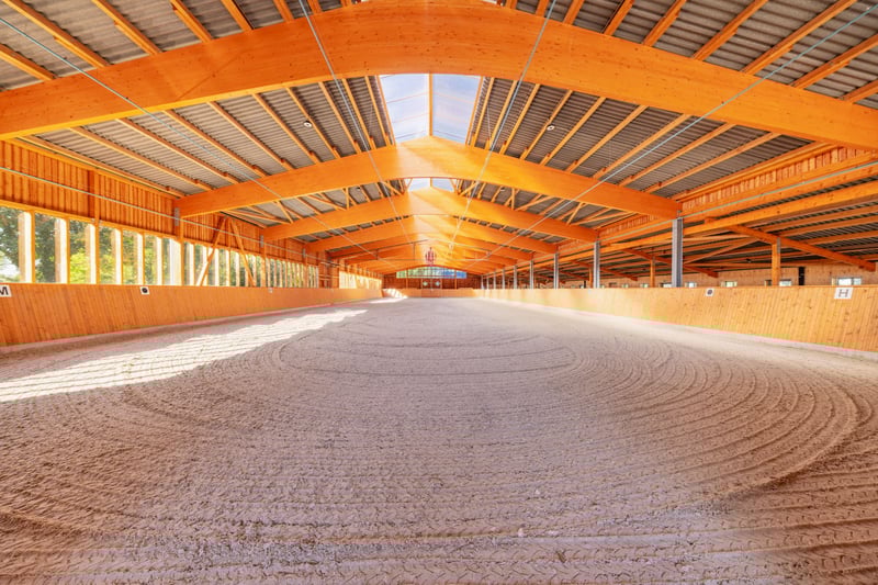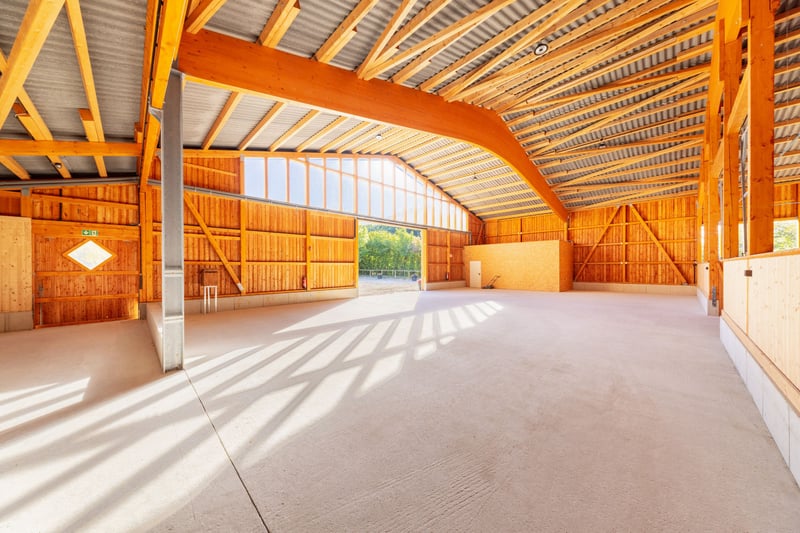 In herrschaftlich erhöhter Lage, eingebettet in eine malerische Landschaft aus sanft ins Tal abfallenden Feldern, präsentiert sich dieser eindrucksvolle Reiterhof als echtes Ausnahmeobjekt. Das Anwesen vereint Großzügigkeit, Funktionalität und Ästhetik auf höchstem Niveau – ideal für professionelle Pferdehaltung, ambitionierte Zucht oder gehobene private Nutzung. Das Gesamtareal umfasst rund 43 Hektar, davon 19 Hektar im Eigentum und weitere 24 Hektar Pachtflächen. Innerhalb des Eigentumsanteils befinden sich etwa 7,6 Hektar hochwertige Ackerflächen, die sich durch ihre ausgezeichnete Bodenqualität und vielseitige Nutzungsmöglichkeiten auszeichnen. Ob für Futterproduktion, Getreideanbau, Sommerweiden oder ökologische Blühstreifen – die Flächen liegen direkt am Hof und ermöglichen eine effiziente Bewirtschaftung und hohe Eigenversorgung des Betriebs. Reithalle – Herzstück der Anlage Das Herzstück der gesamten Anlage bildet die 2023–2024 neu errichtete Reithalle, die mit ihrer beeindruckenden Holzarchitektur und modernster Ausstattung höchsten Ansprüchen im Reitsport gerecht wird. Mit einer Größe von 30 × 80 Metern bietet sie ideale Bedingungen für Dressur-, Spring- und Freizeitreiter. Die Halle wurde in massiver Holzbauweise errichtet und mit einer hochwertigen Lärchenholzfassade versehen, die sich harmonisch in die Umgebung einfügt. Großzügige Fensterbänder und ein durchdachter Lichtfirst schaffen ein helles, freundliches Raumgefühl. Eine professionelle Beleuchtungsanlage sorgt für optimale Sichtverhältnisse – perfekt für Training und Unterricht. Die moderne Düsenrohrberegnung mit Nebeldüsen gewährleistet eine gleichmäßige Bodenfeuchte und konstant hohe Reitbodenqualität. Der Boden selbst ist dreischichtig aufgebaut und bietet ideale Elastizität, Griffigkeit und Schonung für Pferd und Reiter. Integriert sind zehn großzügige Übergrößenboxen (6 à ca. 24 m², 4 à ca. 34 m²) mit frostsicheren Tränken. Die Boxengasse wurde bewusst noch nicht ausgebaut, um individuellen Haltungsformen gerecht zu werden. Die Reithalle wird von einer angrenzenden Maschinen- und Gerätehalle ergänzt, die ausreichend Platz für Fahrzeuge, Heulager und Reitplatzpflege bietet. Stallanlagen und Infrastruktur Die Anlage umfasst insgesamt 25 Pferdeboxen – zehn in der Reithalle, neun im großen Stallgebäude, vier im kleineren Stall und zwei Außenboxen. Das große Stallgebäude aus dem Jahr 1955 wurde 2021 vollständig saniert und bietet auf rund 692 m² flexible Nutzungsoptionen. Hier befinden sich neben den Boxen auch Lager- und Futterräume, ein Einsteller-WC, eine Dusche sowie ein Aufenthaltsbereich. Der kleinere Stall (Baujahr 1990, modernisiert 2023) verfügt über zwei Innen- und zwei Außenboxen. Er wurde in massiver Holzbauweise errichtet, hochwertig beleuchtet und mit langlebigen Leichtzementdachziegeln ausgestattet. Direkt angrenzend befindet sich eine moderne Stallmeisterwohnung mit ca. 100 m² Wohnfläche und Einbauküche – ideal für Personal oder Eigennutzung. Ergänzt wird die Anlage durch eine überdachte Mistplatte, die sämtlichen modernen Umweltstandards entspricht. Sie ist auf einer massiven Betonplatte mit Gefälle errichtet, von stabilen Betonwänden eingefasst und mit großen Schiebetoren ausgestattet, die ein einfaches Befahren ermöglichen. Das robuste Dach schützt den Lagerbereich zuverlässig vor Witterung – ein Beispiel für durchdachte, nachhaltige Planung im gesamten Betrieb. Weiden, Paddocks und Außenanlagen Die weitläufigen Weide- und Paddockflächen sind hochwertig eingezäunt und pferdegerecht gestaltet. Massive Holz-, Litzen- und Elektrozäune aus langlebiger Eiche, Robinie und Douglasie gewährleisten Sicherheit, Langlebigkeit und eine ästhetisch harmonische Einbindung in die Landschaft. Insgesamt stehen acht großzügige Paddocks zur Verfügung – alle mit massiven Holzunterständen und frostsicheren Tränken, die eine artgerechte Haltung das ganze Jahr über ermöglichen. Durch die durchdachte Anordnung und Strukturierung der Flächen ist ein stressfreier Ablauf für Mensch und Tier garantiert. Eine hochwertige Ovalbahn (60 × 30 m) mit Trainerhäuschen und Rundumbeleuchtung erweitert die Trainingsmöglichkeiten erheblich – ideal für professionelles Arbeiten, Unterricht oder Lehrgänge bei jedem Lichtverhältnis. Durch die Kombination aus Eigentums- und Pachtflächen können 80 bis 100 Pferde artgerecht gehalten werden – eine Größenordnung, die nur selten in dieser Qualität und Vollständigkeit zu finden ist. Wohnhaus und Ferienhaus Das Wohnhaus aus dem Jahr 1900 wurde zwischen 2021 und 2023 aufwendig modernisiert. Auf 333 m² Wohnfläche vereint es historischen Charme mit modernem Wohnkomfort. Hohe Räume, edler Stuck, massive Holzfußböden und stilvolle Details verleihen dem Haus eine repräsentative, warme Atmosphäre. Das Dach wurde vollständig neu mit Tonziegeln eingedeckt, die Kupfergauben und Dachrinnen unterstreichen den hochwertigen Charakter. Das Ferienhaus mit rund 30 m² Wohnfläche, 1990 erbaut und 2024 umfassend modernisiert, bietet eine ideale Ergänzung – perfekt für Gäste, Ferienvermietung oder Reiter, die auf der Anlage verweilen. Dieses Anwesen ist weit mehr als ein landwirtschaftlicher Betrieb – es ist ein stimmiges Gesamtkonzept aus Reitsport, Natur und stilvollem Wohnen, das höchste Ansprüche erfüllt. Ein Ort, an dem Professionalität, Nachhaltigkeit und Lebensqualität harmonisch verschmelzen – ein Reiterhof, der in seiner Ausstattung, Lage und Atmosphäre seinesgleichen sucht.