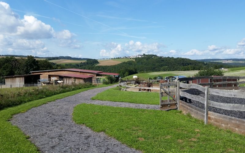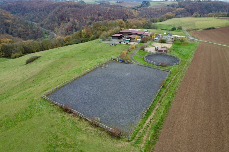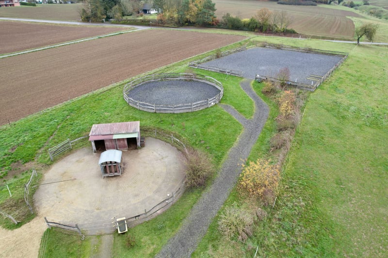 Die angebotene Reitanlage befindet sich in traumhafter Alleinlage mit beeindruckendem Fernblick. Sie erstreckt sich über ca. 17 Hektar Eigenland und bietet die Möglichkeit, bis zu 40 Hektar zusätzliche Pachtflächen zu nutzen. Die Übernahme der Pachtflächen ist optional und frei verhandelbar. In Einzelfällen kann auch der Kauf einzelner Pachtflächen geprüft werden. Ebenso ist es möglich, auf Wunsch das Objekt mit weniger Fläche zu erwerben. Bei dem Angebot über die ca. 17 Hektar Eigenland teilen diese sich wie folgt auf: • Ackerflächen: ca. 4,98 ha (davon 4.600 qm Bauerwartungsland, preislich separat zu bewerten) • Grünland: ca. 10,6 ha • Umwandlungsflächen: ca. 2,82 ha • Pachtflächen: ca. 48 ha (zur Fortführung des Betriebs möglich) Der Großteil der Weideflächen ist arrondiert und so angelegt, dass die Pferde ohne großen Aufwand auf die Flächen gebracht werden können. Optional kann zudem ein erschlossener Bauplatz (Eckgrundstück) mit ca. 760 qm gegen Aufpreis erworben werden. Grundsätzlich besteht eine hohe Flexibilität hinsichtlich der Flächengestaltung. Neben dem Erwerb der Gesamtfläche ist auch der Verkauf von Teilflächen denkbar, sofern dies den Interessentenkreis erweitert. ________________________________________ Betrieblicher Status & Personal Der Betrieb ist voll handlungsfähig und wirtschaftlich aktiv. Es konnten bereits neue Einsteller gewonnen werden, zudem ist die aktuelle Decksaison erfolgreich angelaufen. ________________________________________ Struktur und Konzept der Pferdehaltung Die Reitanlage ist für die Haltung von mehr als 80 Pferden ausgelegt. Das Konzept basiert auf modernen Erkenntnissen der artgerechten Pferdehaltung und setzt überwiegend auf Offen- und Laufstallsysteme, die den individuellen Bedürfnissen der Pferde optimal gerecht werden. Besonders hervorzuheben ist, dass viele Bereiche gezielt für die Haltung von Hengsten konzipiert wurden. Ein weiteres zentrales Merkmal ist die vollständige Befestigung aller relevanten Betriebsbereiche. Das Ergebnis ist ein Betrieb, der praktisch vollständig „matschfrei“ ist und damit ganzjährig problemlos genutzt werden kann. ________________________________________ Autarke Bewirtschaftung Die Anlage ist nicht an öffentliche Versorgungsnetze angeschlossen, wurde jedoch so konzipiert, dass sie vollständig autark und problemlos betrieben werden kann. Dies umfasst unter anderem die Versorgung mit Wasser, Energie und weiteren Betriebsmitteln. Die großen Dachflächen der Gebäude bieten zudem ideale Voraussetzungen für die Installation von Photovoltaikanlagen, wodurch eine nachhaltige Energieversorgung möglich ist. Ausstattung der Anlage Trainings- und Bewegungsflächen Die Anlage verfügt über sehr gute Trainingsmöglichkeiten für Freizeit- und Profireiter. Hierzu gehören: • Reitplatz: 40 × 30 Meter • Roundpen mit 18 Metern Durchmesser Beide Trainingsflächen sind mit einem Swingground-Allwetterboden ausgestattet und somit ganzjährig nutzbar. ________________________________________ Stall- und Weideflächen Die Unterbringung der Pferde erfolgt überwiegend in großzügigen Offenstallanlagen mit: • befestigten Ausläufen • Heuraufen • Sandplätzen Die direkte Anbindung an die Weideflächen ermöglicht einen einfachen Zugang und reduziert den Arbeitsaufwand erheblich. Zusätzlich stehen folgende Stallformen zur Verfügung: • 6 Innenboxen • 6 Außenboxen • 3 Paddockboxen • 8 große Paddockboxen mit dahinterliegenden Ausläufen ________________________________________ Weitere Ausstattung Die Anlage verfügt über zahlreiche durchdachte Funktionsbereiche: • Reiterstübchen mit Ofen, Küche und Sanitäranlagen • Großzügige Sattelkammer mit geräumigen Sattelschränken • Überdachter Wasch- und Putzplatz • Solekammer für gesundheitsfördernde Anwendungen bei Pferden • Nagerfrei konzipierte Futterkammer ________________________________________ Nutzungsmöglichkeiten und Erweiterungspotenzial Die Anlage wird aktuell unter anderem als EU-Besamungsstation betrieben und zeigt damit die große Vielseitigkeit der Nutzungsmöglichkeiten. Eine Voranfrage für den Bau einer Reithalle mit integrierter Wohnmöglichkeit wurde bereits positiv bewertet. Darüber hinaus besteht die Möglichkeit, in der direkten Umgebung Bauplätze zu erwerben, um beispielsweise ein Wohnhaus nach eigenen Vorstellungen zu errichten. Alternativ kann auch eine Mietwohnung in der Nähe genutzt werden. ________________________________________ Fazit Diese hochrentable Reitanlage in Steinsberg vereint modernes Stallmanagement, hervorragende Infrastruktur und eine außergewöhnliche Lage. Mit ihrer Kapazität von über 80 Pferden, der nahezu vollständigen Auslastung, den flexiblen Nutzungsmöglichkeiten, der autarken Bewirtschaftung sowie dem großen Erweiterungspotenzial stellt sie eine zukunftssichere und attraktive Investition für Pferdeliebhaber und professionelle Betreiber dar. Lage: Steinsberg ist eine kleine, charmante Ortsgemeinde im Rhein-Lahn-Kreis in Rheinland-Pfalz. Die idyllische Gemeinde gehört zur Verbandsgemeinde Diez und liegt in einer landschaftlich reizvollen Umgebung, die sowohl Naturfreunden als auch Ruhe suchenden Menschen viel zu bieten hat. Trotz der ruhigen Lage ist Steinsberg verkehrstechnisch gut angebunden. Die Bundesstraße B417 ist in wenigen Minuten erreichbar und ermöglicht eine zügige Verbindung zu den Städten Limburg an der Lahn (ca. 15 km) und Diez (ca. 10 km). Beide Städte bieten umfangreiche Einkaufsmöglichkeiten, kulturelle Angebote und alle wichtigen Einrichtungen des täglichen Lebens. Über die Autobahn A3, die ebenfalls gut erreichbar ist, sind Frankfurt am Main und Köln in etwa einer Stunde Fahrzeit zu erreichen. Die Reitanlage selbst liegt in völliger Alleinlage außerhalb des Ortes, umgeben von weitläufigen Wiesen und Feldern. Diese abgeschiedene Position bietet nicht nur eine unvergleichliche Ruhe und Privatsphäre, sondern auch ide