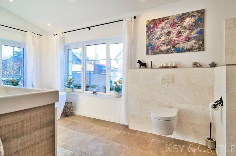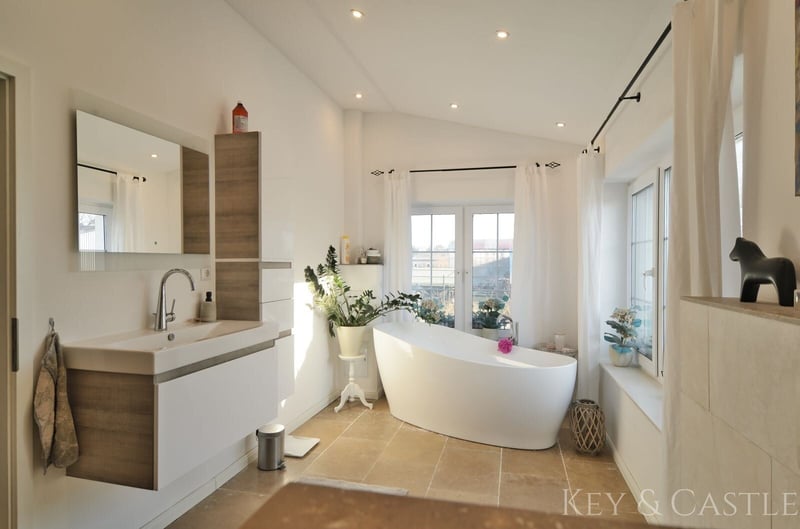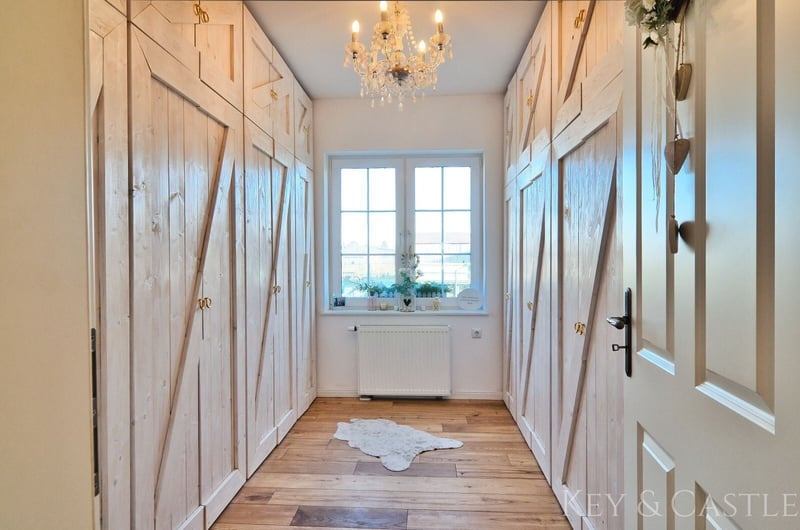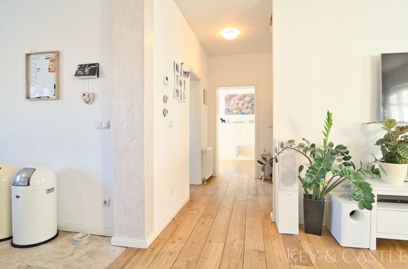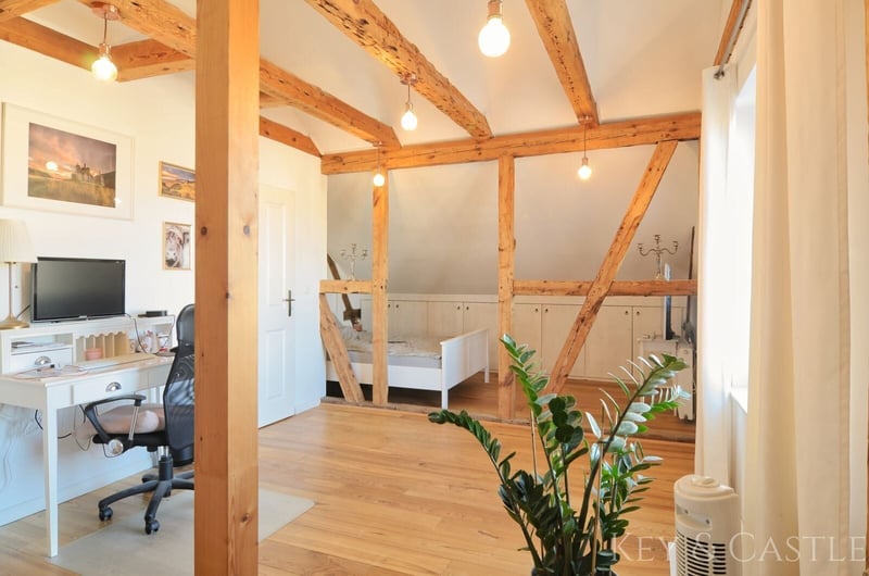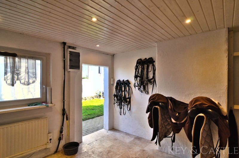 Property Description: This exceptionally well-maintained single-family home in Oberkrämer combines rural tranquility with exclusive living comfort. Originally built in 1936, the house was extensively renovated between 2017 and 2021 and now presents itself in nearly new condition. All renovation and refurbishment work was carried out with the utmost care and without compromise on quality and materials—an approach reflected in every detail. A particular highlight is the opportunity for horsekeeping directly at the property, complemented by a professionally renovated barn and stables. This makes the property ideal for horse enthusiasts who wish to combine living and hobby at the highest level. Horsekeeping & Outbuildings: A unique feature of this property is the direct horsekeeping at the house: - Fully renovated barn - Stables, feed room, and saddle room - Riding arena with two indoor riding halls just a few hundred meters away - Perfect conditions for private horsekeeping Property & Outdoor Area: The spacious plot of approximately 1,748 m² offers plenty of space for relaxation and leisure: - Pool (8 × 4 m, tiled) with pump and frost protection heater - High-quality terrace - Well-maintained garden - Quiet, natural setting This property is in an exceptionally well-kept, near-new condition. All renovation measures were executed with great care, and no expense was spared, which is clearly reflected in the quality of the materials used, craftsmanship, and overall ambiance. Move in and feel at home—no renovation needed. Features: - Major renovation of the main house in 2017 - Roof & facade renewed in 2018 - Barn fully renovated in 2019 - Terrace built in 2020 - Pool installation in 2021 - Exercise area 17 × 60 m - Paddock 8 × 20.5 m - Open stable with interior dimensions of 3.6 × 8.6 m - Extremely well-maintained, near-new condition - High-quality materials (including Travertine natural stone) - Horsekeeping possible directly at the house - Riding arena with two indoor riding halls in close proximity Living & Layout: The house offers approximately 130 m² of living space, distributed over the ground floor and an expanded attic, plus additional utility areas. The layout is spacious, open, and filled with natural light: - 4 rooms - Open living/dining area - Large, high-quality country-style fitted kitchen (new approx. €7,000) - Dressing room - Generous hallway - High ceilings (about 2.65 m) - Large windows providing excellent light conditions The floors are predominantly finished with high-quality Travertine natural stone, emphasizing the house’s exclusive character. Bathrooms & Equipment: The bathrooms were completely renovated during the major refurbishment and are finished to a high standard: - Modern, elegant bathrooms - Travertine in warm beige and brown tones - High-quality fixtures - Guest WC - Underfloor heating in key areas The stables, feed room, and saddle room were also upgraded with high-quality materials and are in excellent condition. The spacious paddock, measuring 17 × 60 m, was constructed with a sand-vlies mixture and is ideal for riding due to its size. Location: The property is situated in Oberkrämer in a quiet, idyllic residential area along a low-traffic street with a footpath and bike path. A bus stop is approximately 300 meters away, and schools and kindergartens are within walking distance. The nearby Krämerwald (about 1 km) offers diverse recreational opportunities. Shopping facilities can be found in the surrounding towns of Bötzow, Velten, Hennigsdorf, and Schönwalde. The buyer’s commission is 3.57% of the actual purchase price including statutory VAT. The commission is not included in the purchase price and is payable by the buyer to KEY & CASTLE GmbH (Walliser Str. 15, 13407 Berlin). It is due and payable at the notary appointment. This offer is subject to change and is made in accordance with our General Terms and Conditions.