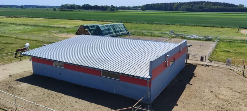 Reithalle (gebaut 2020): 48m x 23m, ausgestattet mit neuem Quarzsubstrat (2023) mit automatischer Bewässerung von unten