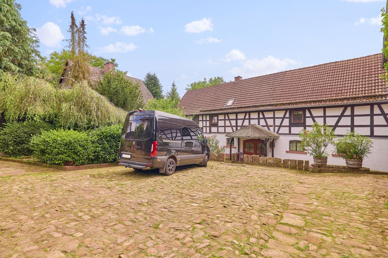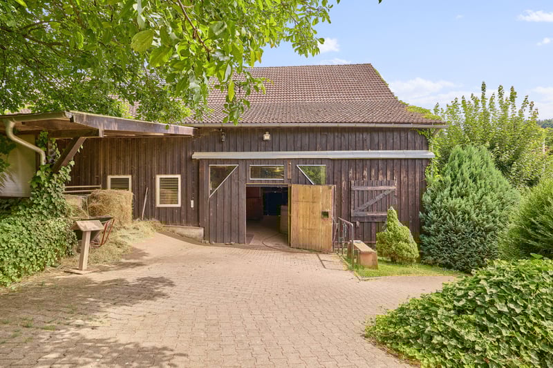 Bitte füllen Sie das nachfolgende Kontaktformular vollständig aus bevor Sie uns telefonisch kontaktieren. Vielen Dank für Ihr Verständnis! Pferdeimmobilie im Odenwald zur privaten und exklusiven Pferdehaltung! Objektbeschreibung: Wir freuen uns, Ihnen dieses äußerst gepflegte und liebevoll gestaltete Hofensemble in Erbach im Odenwald präsentieren zu dürfen. Das Anwesen erreichen Sie über eine private Hofzufahrt mit hochwertigem Tor. Hinter der Einfahrt öffnet sich ein romantischer Innenhof, der den besonderen Charme und die Ruhe dieses Anwesens widerspiegelt. Die Hofanlage bietet ideale Voraussetzungen für die private Pferdehaltung: Ein Reitplatz mit den Maßen 19 × 48 Meter, ausgestattet mit Flutlichtanlage und massiver Umzäunung, ermöglicht flexibles Training. Für Ihre Pferde stehen fünf großzügige, helle Boxen mit beheizbaren Tränken, sehr große Paddockflächen mit Offenställen sowie angrenzende Weideflächen zur Verfügung. Das Scheunengebäude bietet nicht nur Platz für Heu- und Strohlagerung, sondern auch eine beheizte Sattelkammer. Die Gesamtfläche des Anwesens beträgt 9.499 m² – ein weitläufiges Grundstück, das Mensch und Tier gleichermaßen Raum zur Entfaltung bietet. Ein gewachsener Baumbestand spendet natürlichen Schatten und verstärkt das naturnahe Ambiente. Ein weiteres Grundstück mit rund 1.500 m² Fläche kann angrenzend erworben werden, ebenso gibt es die Option weitere Koppeln zu pachten. Das Wohnensemble umfasst insgesamt ca. 447 m² Wohnfläche, verteilt auf zwei Gebäude. Das Haupthaus (Einfamilienhaus) wird derzeit zu privaten Wohnzwecken genutzt. Das Nebengebäude beherbergt aktuell eine Wohneinheit sowie einen gewerblich genutzten Bereich mit Lager- und Büroräumen. Ursprünglich als zwei separate Wohneinheiten konzipiert, lässt sich diese Nutzung problemlos wiederherstellen. Ein liebevoll angelegter Garten mit Fischteich, finnischem Grillhaus und einer Wellness-Terrasse rundet das Angebot ab und macht das Anwesen zu einem Ort mit hoher Lebensqualität. Vereinbaren Sie gerne einen Besichtigungstermin – dieses besondere Anwesen vereint Lebensqualität, Funktionalität und eine enge Verbindung zur Natur auf eindrucksvolle Weise. Ausstattung: Haupthaus (Einfamilienhaus): - Fischteich im Garten, große und gemütliche Terrasse, Grillhaus im Garten - Vollständig renoviert, großrahmige Steinfliesen, aufgesetzte Natursteine als optisches Highlight - 2 Kaminöfen, gemütliches Flair - Befeuerung: Öl Heizung - Offene Küche mit hochwertigen Miele und Gaggenau-Geräten - Im Erdgeschoss befindet sich ein Bad mit bodentiefer Dusche und Fenster - 2 Schlafzimmer mit Ankleide und Gäste-WC im Obergeschoss - Fußbodenheizung im Erdgeschoss - Fenster: Doppeltverglasung mit Sprossen Nebengebäude (Wohnen & Gewerbe): - Ursprünglich befinden sich hier zwei eigenständige Wohnungen - Derzeit: eine Wohnung & eine Gewerbeeinheit mit Büros - Wohnung: Badezimmer mit Badewanne, ein Schlafzimmer, Küche und Wohnbereich - Fußbodenheizung - Öfen in den Wohnbereichen - Wellness-Terrasse in Richtung Reitplatz mit Whirlpool Scheunengebäude: - ca. 200 m² Nutzfläche - Hobbyraum und derzeit Sattellager - Werkstatt mit Tor zum Innenhof - Weinkeller - Heulager im Obergeschoss (von Straße aus zu beladen) - Anschleppung als tägliches Heuzwischenlager (2-3 Ballen) - Stallungen und Sattelkammer Unterbringung der Pferde / Stallbereiche: - Festboxen im Scheunengebäude: 4 Innenboxen, 1 Außenbox - Teilweise gummierte Stallgasse - Beheizte und somit frostfreie Tränken - Pferdesolarium vorhanden - Offenställe mit Weidehütten auf rund 1.500 m² Paddockflächen (befestigt) - Hochwertige Holzzäune mit Strom-Litzen - Großzügige und beheizte Sattelkammer Reitplatz: - Reitfläche: ca. 19 x 48 Meter (schräg zulaufend) - Boden: Sandgemisch, Drainage vorhanden - Flutlichtanlage - Gemütliche Sitzecke am Reitplatz Koppeln: Direkt ab Hof zu begehen gelangen Sie auf die weitläufigen Koppelflächen. Weiteres: - Mistplatte - 2 Brunnen zur Bewässerung vorhanden - Alter Baumbestand sorgt für eine angenehme Beschattung - Innenhof mit historischem Kopfsteinpflaster, Sandstein-Elementen und Fachwerk Lage: Die angebotene Immobilie befindet sich in einem Stadtteil von Erbach im südhessischen Odenwaldkreis. Die Stadt Erbach liegt an der B 45, B 47. Eine seit den 1970er Jahren projektierte Umgehungsstraße der B 45 ist wieder in die Investitionsplanung des Landes Hessen aufgenommen worden. Die Ortschaft wird für den überörtlichen Verkehr durch die Kreisstraße K 46 erschlossen, die von der Bundesstraße 45 im Mümlingtal über Günterfürst zu diesem Ort hinaufführt und hier endet. Die Buslinie 48 der Odenwald-Regional-Gesellschaft stellt den öffentlichen Personennahverkehr sicher. Mit der Schiene ist Erbach an die Odenwaldbahn von (Frankfurt–Darmstadt/Hanau–Erbach–Eberbach) angebunden. Die Ortschaft liegt rund drei Kilometer südlich der Kernstadt Erbach im Buntsandstein-Gebiet des Odenwaldes. Zusammen mit dem nördlich angrenzenden Günterfürst wurde es westlich der Mümling auf einer Anhöhe 322 Meter hoch in einer Rodung angelegt. In der Ortslage befindet sich das Quellgebiet eines Baches, der sich nach Osten zur gut einen Kilometer entfernten Mümling wendet. Erbach grenzt im Norden an die Stadt Michelstadt, im Osten an den Markt Kirchzell (Landkreis Miltenberg in Bayern), im Süden an die Stadt Oberzent sowie im Westen an die Gemeinde Mossautal (beide im Odenwaldkreis). Die Städte Erbach und Michelstadt mit ihren nur zwei Kilometer voneinander entfernt liegenden Zentren sind baulich längst zusammengewachsen und bilden mit zusammen fast 30.000 Einwohnern den wirtschaftlichen Schwerpunkt des Odenwaldkreises. In Erbach gibt es mehrere Restaurants, Cafés, Ärzte, Bäckereien und Supermärkte. Auch mehrere Modegeschäfte, Grün- und Parkanlagen, zwei Fitnessstudios, zwei Bibliotheken und eine Buchhandlung sind fußläufig gut zu erreichen. Über interessante