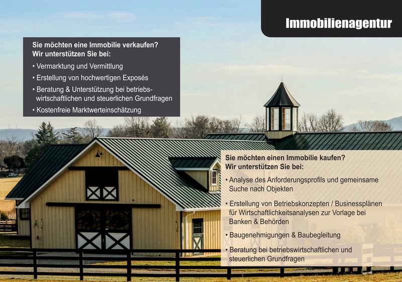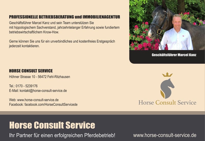 Die Horse Consult Service GmbH ist in ihrem Fundament eine spezialisierte Unternehmensberatung für Pferdebetriebe. Ein besonderer Schwerpunkt liegt – neben der klassischen Betriebsberatung – auf allen Fragen rund um die Pferdeimmobilie. Gerade die Verbindung aus Unternehmensberatung und Maklertätigkeit macht uns einzigartig – und bietet unseren Kunden entscheidende Vorteile. Ob Verkauf oder Kauf, Fragen zu Steuern, Finanzierung, Rentabilität oder Baurecht – wir begleiten jeden Schritt fundiert und praxisnah. Der Kauf bzw. Verkauf einer Pferdeimmobilie wie einer Reitanlage oder einem Reiterhof findet meist nur einmal im Leben statt und so ist man mit Fragen und Aufgaben konfrontiert, mit denen man sonst wenig zu tun hat. Dies sind betriebswirtschaftliche und steuerliche Belange, aber auch Fragen zur Finanzierung, Baugenehmigungen, Fördergelder uvm. Durch unsere jahrelange Begleitung beim Kauf und Verkauf von Reitanlagen, Reiterhöfen, Wohnhäusern mit Pferdehaltung oder Resthöfen können wir Sie sowohl auf Käufer- wie auch auf Verkäuferseite beraten und alle Fragen und Aufgaben mit Ihnen zusammen bewältigen. Wir sind am Markt selbst als Makler aktiv und führen als Immobilienagentur für Pferdeimmobilien das wohl größte Angebot in Deutschland.