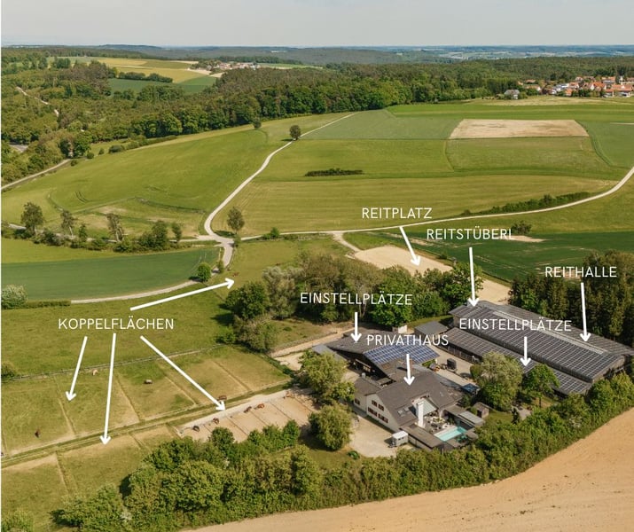 Nur ca. 15 Fahrminuten von Regensburg entfernt in der Gemeinde Sinzing befindet sich THE RANCH – ein außergewöhnlicher Reiterhof auf über 8 Hektar. Hier verbinden sich: • professionelle Pferdehaltung • durchdachte Infrastruktur • nachhaltige Bewirtschaftung • exklusives Wohnen zu einem Gesamtanwesen, das in dieser Form nur selten am Markt verfügbar ist. Bereits bei der Ankunft wird deutlich, dass es sich hier nicht um eine gewöhnliche Immobilie handelt. Die gesamte Anlage ist klar strukturiert, hochwertig ausgeführt und auf effiziente Abläufe ausgelegt – ideal für alle, die Pferdehaltung sowohl mit Leidenschaft als auch wirtschaftlich betreiben möchten. Die Reitanlage – professionell, vielseitig und sofort nutzbar Auf rund 8 Hektar entfaltet sich eine Reitanlage, die in dieser Form selten zu finden ist. Im Zentrum steht die moderne Reithalle (25 × 50 m, Baujahr 2013), die ganzjährig optimale Trainingsbedingungen bietet. Aktuell auf Westernreiten ausgelegt, lässt sich die Anlage mit geringem Aufwand flexibel auf andere Disziplinen wie Dressur, Springen oder Vielseitigkeit umstellen. Ein besonderes Highlight ist das direkt integrierte Reitstüberl das als Treffpunkt für Reiter und Gäste dient und eine einzigartige Atmosphäre schafft. Der Zuschauerbalkon ermöglicht dabei einen perfekten Blick auf das Geschehen – ideal für Kurse, Veranstaltungen oder Turniere. Ergänzt wird die Reitanlage durch einen großzügigen Außenreitplatz (28,5 × 90 m), der sowohl für anspruchsvolles Training als auch für Turniere geeignet ist. Die Stallanlage ist vollständig ausgebaut und bietet Platz für ca. 30 Pferde. Sie überzeugt durch ihre durchdachte Struktur und flexible Nutzungsmöglichkeiten: Insgesamt stehen 14 Innenboxen, davon 3 Abfohlboxen mit Kameraüberwachung, 9 Paddockboxen sowie 2 Offenställe (1 davon mit direktem Koppelzugang) zur Verfügung. Ergänzt wird die Anlage durch 7 große Sandpaddocks im Außenbereich sowie überdachte Paddockbereiche. Großzügige, direkt angrenzende Koppelflächen bieten optimale Bedingungen für Haltung, Training und Zucht. Ein weiterer wesentlicher Aspekt ist das durchdachte Sicherheitskonzept der Anlage. Das gesamte Anwesen ist über eine Schrankenanlage mit Nummernschilderkennung organisiert, wodurch der Zugang gezielt gesteuert werden kann. Ergänzend dazu sind zentrale Bereiche wie Reithalle, Hof und Stallungen videoüberwacht. Dieses System sorgt nicht nur für ein hohes Maß an Sicherheit, sondern schafft auch Vertrauen – sowohl für Betreiber als auch für Einsteller und Kunden. Effizienz & Struktur – wirtschaftlich und zukunftssicher Die gesamte Anlage ist kompakt und logisch aufgebaut, wodurch kurze Wege und klare Abläufe den täglichen Betrieb erheblich erleichtern. Dadurch lässt sich der Hof mit vergleichsweise geringem Personalaufwand effizient führen – ein entscheidender wirtschaftlicher Vorteil. Zusätzlich überzeugt THE RANCH durch ein nachhaltiges Energiekonzept: Eigene Wiesen dienen der Heugewinnung, während der angrenzende Wald Hackschnitzel für die Wärmeversorgung liefert. Eine Holz-Pelletheizung, Photovoltaikanlage, Wärmepumpe für den Pool sowie eine separate Wärmepumpe für die Pferdedusche sorgen für einen weitgehend autarken und kosteneffizienten Betrieb. Die Warmwasseraufbereitung erfolgt ergänzend über Öl. Das Wohnhaus – Großzügigkeit, Atmosphäre und maximale Flexibilität Direkt am Innenhof gelegen, mit Blick auf die gesamte Anlage und dennoch vollkommen privat, präsentiert sich das Wohnhaus als stilvoller Rückzugsort. Das im Jahr 2011 umfassend generalsanierte Gebäude (Ursprungsbau 1980er Jahre) vereint heute ländlichen Charme mit modernem Wohnkomfort und hochwertiger Ausführung. Auf ca. 319 m² Wohn- und Nutzfläche erstreckt sich ein großzügiges Raumkonzept, das aktuell als eine Einheit genutzt wird, sich jedoch problemlos in zwei separate Wohneinheiten mit eigenen Eingängen aufteilen lässt. Bereits der Eingangsbereich führt in einen lichtdurchfluteten Küchen- und Essbereich mit direktem Zugang zur Terrasse und zum Pool. Große Fensterflächen schaffen eine offene, einladende Atmosphäre – ein zentraler Ort für gemeinsames Leben und gesellige Momente. Ein Gäste-WC sowie der direkte Zugang zur Garage und Waschküche sorgen für eine besonders praktische Alltagsstruktur, insbesondere im Zusammenspiel mit dem Hofbetrieb. Das Herzstück des Hauses bildet der beeindruckende Wohnbereich mit offenem Dachstuhl, sichtbaren Holzbalken und großzügigen Raumhöhen. Große Dachfenster durchfluten den Raum mit Licht, während der Kamin eine warme, gemütliche Atmosphäre schafft. Zwei Zugänge zur Terrasse verbinden Innen- und Außenbereich auf harmonische Weise. Über eine elegante Treppe im Landhausstil gelangt man auf die offene Galerie, die nicht nur einen eindrucksvollen Blick in den Wohnraum bietet, sondern auch zusätzliche Nutzungsmöglichkeiten eröffnet. Von hier aus erschließt sich ein weiterer Wohnbereich, der als eigenständige Einheit genutzt werden kann – mit Büro, separater Küche, Balkon, zwei Schlafzimmern sowie einem großzügigen Badezimmer. Ein zusätzliches Gästezimmer mit eigenem Bad ergänzt diesen Bereich ideal. Ein separat zugängliches Appartement mit eigenem Bad und Küchenzeile bietet maximale Flexibilität – ob als Mitarbeiterwohnung, Gästebereich oder zur Vermietung. Das Haus verfügt über insgesamt 6 Garagenplätze sowie zusätzliche Stellflächen im Innenhof, wodurch ausreichend Platz für Fahrzeuge, Pferdeanhänger und Equipment vorhanden ist. Wellness & Lebensqualität – ein Ort zum Ankommen Auch der Außenbereich unterstreicht den besonderen Charakter dieses Anwesens. Die großzügige Terrasse lädt zu entspannten Sommerabenden ein, während der ganzjährig nutzbare Pool mit Schiebedach, die Sauna und der Whirlpool für ein Höchstmaß an Komfort sorgen. Ein Poolhaus ergänzt das Ensemble und macht den Gartenbereich zu einer e