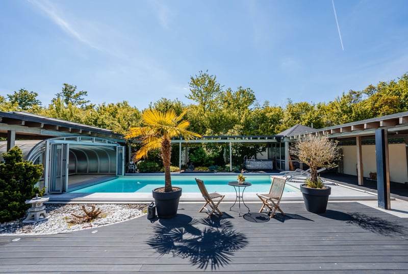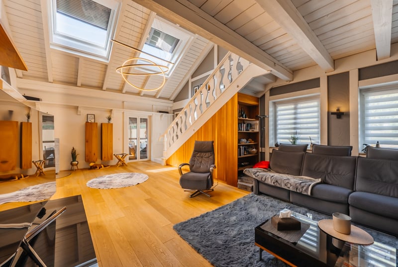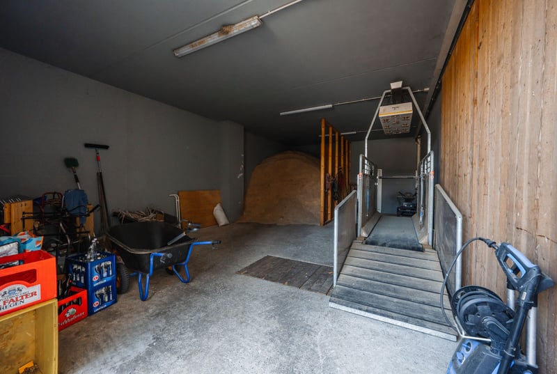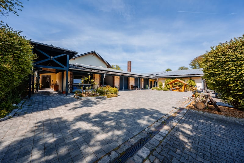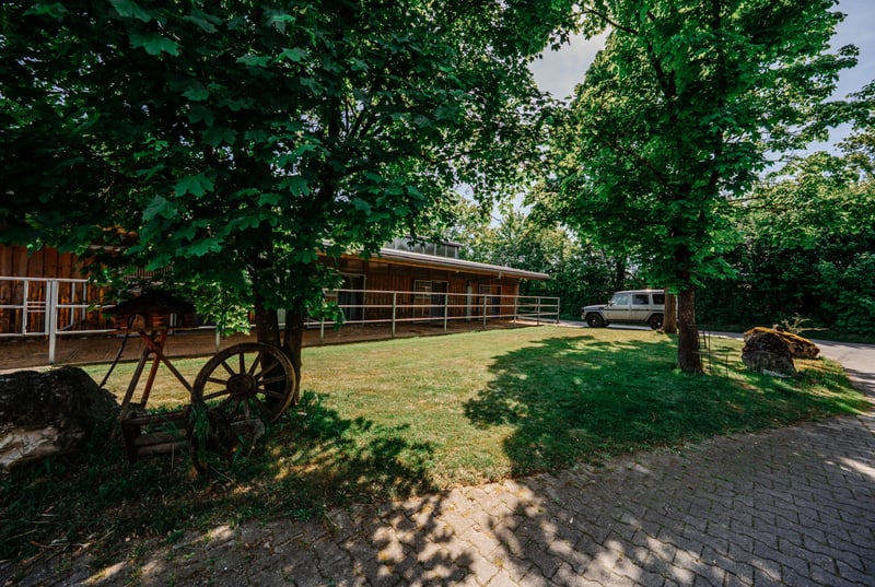 In a tranquil location in Sinzing, this beautiful ranch offers a perfect blend of living and working with horses. With just over 17,000 residents, Sinzing boasts a good infrastructure. Whether it's train connections, supermarkets, doctors, or banks – everything is available and easily accessible. The nearby Danube River is about a 10-minute walk away, inviting relaxing strolls. THE RANCH stands for a lifestyle concept that combines a connection to nature with modern comfort – driven by a passion for horses. A place that harmoniously brings together all these elements: living, working, and personal hobbies merge here into a holistic lifestyle. Directly located at the courtyard, with a view of the facility – yet completely private – is the residential house. Originally built in the 1980s, the house underwent extensive renovations in 2011 and now presents itself as a stylish retreat with rural charm. Approximately 319 m² of living and usable space is spread across two potentially independent units – currently united into a spacious whole. (2 separate entrances available) For those seeking something special: quietly located, close to nature – yet right in the middle of it all. The Residential House The entrance leads into an open kitchen and dining area, flooded with light and generously sized – featuring a large dining table that offers views out to the terrace and pool through the large windows. This is where cooking, laughter, and living happen. A place for family, friends, and special moments. Adjacent to this area is a guest toilet and direct access to the garage – practical for quickly getting groceries into the fridge. From the garage, you can also directly access the laundry room, discreetly and functionally integrated. (Very convenient for a quick entry from the yard into the house – simply through the garage) The living area is the heart of the house: High ceilings, an open roof structure, visible wooden beams, a fireplace for cozy hours – and large skylights that flood the room with daylight. Two terrace accesses open the space to the outside. An elegant country-style staircase leads up to an open gallery, which not only impresses visually but also offers a view – both to the outside and back into the living area. There is also a small bathroom with a shower and toilet on this level. From the gallery, a passage leads to the second unit, which is currently part of the overall space but could be separated and used independently if needed. This level begins with an office, ideal for a home office or administration. The path continues into another kitchen with a dining area, also with access to a balcony overlooking the courtyard – a quiet spot for the first coffee of the morning. A long hallway leads to two bedrooms, one of which has a staircase down to a wash and storage room – versatile for supplies, as a technical room, or as a hobby or guest room. The other branch of the hallway leads to a large bathroom with a shower, bathtub, and toilet – spacious and stylishly designed. At the end of this hallway is another guest room with its own bathroom, including a shower and toilet – perfect for visitors or family members who want their own space. Guest Apartment – Versatile & Independent A special bonus is the small, separately accessible apartment in the house – with its own bathroom (shower/toilet), living/sleeping area, and a compact kitchenette. Perfect for staff, guests, or rental – however you need it. Garage & Outdoor Area The house offers a total of 4 integrated garages, supplemented by 2 additional ones – totaling 6 garage spaces, providing ample room for vehicles, trailers, or equipment. Additionally, the courtyard offers 4 more parking spaces. The Garden Oasis The large terrace invites long summer evenings filled with extensive barbecue delights. The outdoor pool features a practical sliding roof, allowing for year-round use. For those who prefer more heat, there’s a sauna or a bubbling hot tub. A small pool house rounds off the bathing pleasure. The Equestrian Paradise On approximately 2.5 hectares of land, a riding facility unfolds that is second to none – thoughtfully planned, lovingly maintained, ready for new stories. – An indoor riding arena (25 x 50 m) built in 2013, currently set up for Western riding – but easily adaptable for any riding style. – Directly in the riding arena is a riding lounge – perfect for shared moments with fellow riding enthusiasts. From the in-house spectator balcony, it’s possible to enjoy a perfect view of events. For example, Western-style events become a visual delight for owners and guests. – An outdoor riding arena (28.5 x 90 m), large enough for competition ambitions – or simply the perfect daily training space. – Stalls and two open stables for around 30 horses, embedded in generous paddock areas. Three foaling boxes with camera monitoring – ideal for breeders. – Ample parking space (for cars and trailers) is available for boarders and guests. The private area is secured by a barrier system with license plate recognition. – Additional security features: Selected areas, including the riding arena, courtyard, and another box, are under video surveillance. The property also includes open spaces and forest areas in close proximity. The meadows are used for hay production, while the forest provides wood chips for self-sufficient heating – ecological, efficient, and independent. Heating type: Wood pellet heating, oil for hot water preparation, heat pump for the pool (operated via the PV system), and a separate heat pump for the hot water supply for the horse shower. This extraordinary property combines stylish living, a love for horses, and relaxation at the highest level. With its riding facility, pool, and thoughtful architecture, it offers space for living, working, and lifestyle – all in one place.