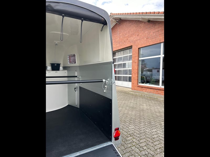 Humbaur Single Alu 1600 Pferdeanhänger PKW Anhänger Alter: Neu (Produktionsjahr: 2025) 2 Jahre Hauptuntersuchung ab dem Tag der Erstzulassung Inkl. Zulassungspapiere (Kfz-Brief / Zulassungsbescheinigung Teil 2 und COC) Verfügbar ab: Ca. 6 Wochen nach Bestelleingang (unverbindlich) Finanzierung über unsere Partnerbanken möglich! Technische Daten Zulässiges Gesamtgewicht: 1.600kg Leergewicht: ca. 690kg Nutzlast: ca. 910kg Achsenanzahl: 2 Laderaumlänge: 3.222mm Laderaumbreite: 1.302mm Laderaumhöhe: 2.310mm Bremsenart: Gebremst, Auflaufbremse Fahrgestell: Tieflader (Räder neben Aufbau), Gummifederachsen Elektrik: 12V, 13 poliger Stecker Reifengröße: 175/70 R13 Sonderausstattung EquiDrive® Fahrwerk inkl. Radstoßdämpfer (100 km/h-Zulassung) Auflaufklappe mit Trittleistengummi Abschließbare Sattelkammer Single Alu mit Sattelhalter, Trensenhalter, Spiegel und Netz Serienausstattung Seitentrittschutz Alu-BiComp-Boden 21mm (kein Holz - unverrottbar) Gummiboden 8mm stark Aufbau aus doppelwandigen, eloxierten Aluminiumprofilen Heckabstützung mit Beleuchtung Einstiegstür mit 3-Punkt-Verriegelung Geteilte und höhenverstellbare Brust- und Heckstangen mit Panikentriegelung Getönte Ausstellfenster in Polyhaube Polyhaube in Black Metallic Innenbeleuchtung Heunetzring Windschott Automatisches Stützrad Rahmen verzinkt V-Deichsel AL-KO oder Knott Achsen und Bremsanlage Zubehör (aufpreispflichtig) Abschließbare Sattelkammer Single Alu mit Sattelhalter, Trensenhalter, Spiegel und Netz Alufelgen Silver / Black Sattelablagestange für 2 Sättel (außen) Schwenkbare Sattelablage für 1 Sattel (außen) Dachfenster EquiGuard Transportsicherheits-System Fohlengitter Heckklappe mit Trittleistengummi Hecktür dreh- und schwenkbar Mitteltrennwand für Single Trittschutzgummi für Sattelkammer Seitenpolsterung links und rechts Planenrollo PVC anstatt Windschott Verschleißmatte vorne Verschleißmatte hinten Anhängerschloss Reserverad 175/70 R13 inkl. Reserveradhalter Fahrzeuganlieferung deutschlandweit Zulassung deutschlandweit Überführungskennzeichen (5 Tage gültig) Hinweis Gewichtsangaben können je nach Ausstattung abweichen; Irrtümer, Zwischenverkauf und Änderungen vorbehalten!