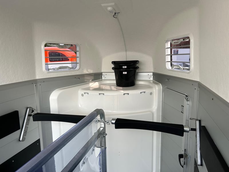 Humbaur Xanthos Aero 2400 Horse Trailer Car Trailer Age: New (Year of Manufacture: 2025) 2 years of main inspection from the date of first registration Includes registration documents (vehicle registration certificate / registration certificate part 2 and COC) Available from: Approximately 6 weeks after order confirmation (non-binding) Financing through our partner banks possible! Technical Data Permissible total weight: 2,400kg Empty weight: approx. 855kg Payload: approx. 1,545kg Number of axles: 2 Loading space length: 3,447mm Loading space width: 1,714mm Loading space height: 2,364mm Brake type: Braked, overrun brake Chassis: Low loader (wheels beside the body), rubber suspension axles Electricity: 12V, 13-pin connector Tire size: 195/65 R15 Special Equipment Side padding left and right Lockable saddle chamber with pull-out saddle holder, bridle holder, mirror, net, interior lighting, shovel, and broom Rear door swing and tilt Standard Equipment EquiDrive® chassis including wheel shock absorbers (100 km/h approval) Alu-BiComp floor 21mm (no wood - rot-proof) Rubber floor 8mm thick Side step protection Body made of double-walled, anodized aluminum profiles Aerodynamic poly nose Rear support with lighting Entry door with 3-point locking Overrun flap with step edge rubber Dividable and height-adjustable breast and rear bars with EquiGuard® panic release EquiLock® lockable partition wall Tinted opening windows in poly hood Poly hood and nose in Dark Blue Metallic Interior lighting Hay net ring Wind deflector Automatic support wheel Frame galvanized V-drawbar AL-KO or Knott axles and brake system Accessories (additional charge) Aluminum rims Silver / Black Saddle rack for 2 saddles (outside) Swiveling saddle rack for 1 saddle (outside) Roof window Foal grid Rear door swing and tilt Continuous box bar for foal transport Step protection rubber for saddle chamber Side padding left and right Head partition wall for center partition wall Partition wall with wooden panel Lockable saddle chamber with pull-out saddle holder, bridle holder, mirror, net, interior lighting, shovel, and broom Without lockable saddle chamber Western saddle chamber with saddle, stirrup, and bridle holder Tarpaulin roller PVC instead of wind deflector Poly hood in color GRP rear hatch in color Wear mat front Wear mat rear Sealing rear hatch according to EC No. 1/2005 Contour marking horse trailer all around on rear hatch Trailer lock Spare wheel 195/65 R15 including spare wheel holder Vehicle delivery nationwide Registration nationwide Transfer license plate (valid for 5 days) Note Weight specifications may vary depending on equipment; errors, intermediate sales, and changes reserved!