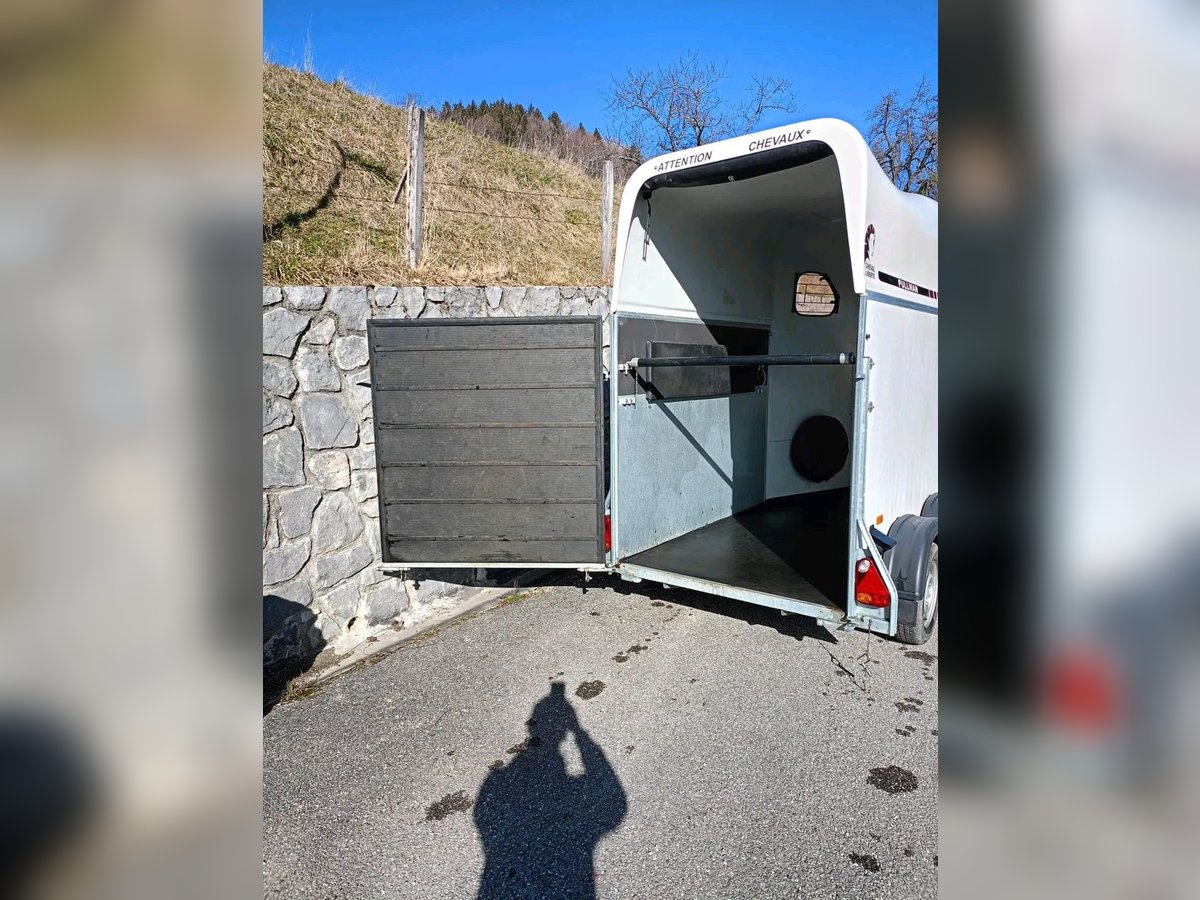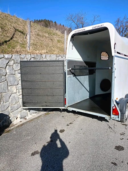Plancher aluminim Suspension pullmann 2,2 Hublots latéraux ouvrants Pont porte arrière Rideau arrière automatique Matelassage, barres de poitrail et barre de croupe réglable en hauteur et en profondeur. Roue jockey automatique Ptac 1200kg Poid a vide 680kg Roue de secours avec support Très bon etat Prix à revoir légèrement