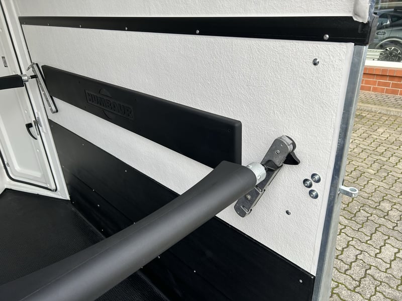 Humbaur Style 2700 S Carriage horse trailer Car trailer Condition: New (Year of manufacture: 2023) 2 years main inspection from the date of first registration Includes registration documents (vehicle registration certificate part 2 / registration certificate and COC) Available immediately (in stock)! Financing available through our partner banks! Technical data Maximum permissible total weight: 2,700 kg Unladen weight: approx. 940 kg Payload: approx. 1,760 kg Number of axles: 2 Loading length: 3,460 mm Loading width: 1,710 mm Loading height: 2,370 mm Braking system: Braked, overrun brake Chassis: Low-loader (wheels beside the body), rubber suspension axles Electrical system: 12V, 13-pin connector Tire size: 195/65 R15 Special equipment Silver / Black alloy wheels Panoramic window Side padding on both sides Standard equipment EquiDrive® Plus S chassis incl. shock absorbers and coil spring suspension (approved for 100 km/h) Alu-BiComp floor 21mm (no wood – rot-proof) 8mm thick rubber flooring Side step protection Body made of GFK with anodized aluminum profiles Aerodynamic poly-aluminum body Lockable tack room with pull-out saddle rack, bridle hooks, mirror, net, interior lighting, shovel, and broom Rear support with lighting Entry door with 3-point lock Overrun tailgate with rubber tread strip Split and height-adjustable front and rear bars with EquiGuard® panic release EquiLock® lockable partition wall Tinted side windows in poly cover Poly cover and nose in Dark Blue Metallic Interior lighting Horse net ring Windbreak Automatic support wheel Zinc-plated frame V-shaped drawbar AL-KO or Knott axles and brake system Optional accessories (additional charge) Silver / Black alloy wheels Saddle rack for 2 saddles (external) Swiveling saddle rack for 1 saddle (external) Roof window Foal grille Rotatable and pivotable rear door Continuous box bar for foal transport Rubber step mat for tack room Side padding on both sides Head partition for middle divider Partition wall with wooden panel PVC roll-up tarpaulin instead of windbreak Poly cover in color Wear-resistant mat at the front Wear-resistant mat at the rear Sealing of tailgate according to EC No. 1/2005 Contour marking of horse trailer all around the tailgate Panoramic window Trailer lock Spare wheel 195/65 R15 including spare wheel holder Vehicle delivery throughout Germany Registration throughout Germany Transport license plates (valid for 5 days) Note Weight specifications may vary depending on equipment; errors, prior sale, and modifications reserved!
