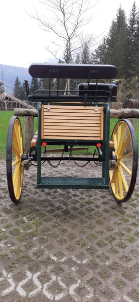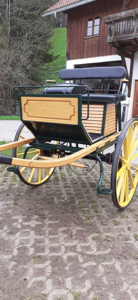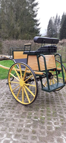 Gig for large horses for sale. Top-maintained and technically flawless. Freiberger, Belgian and Friesian horses ran in front of the carriage. It is easy to balance and therefore easy to adjust. There is a spacious storage compartment under the seat. Dimensions: Track width: 1.46 m, wheel height: 1.12 m, wheel width: 6 cm, seat width: 1.05 m, seat height (without trestle wedge): 1.38 m, trestle wedge: 14 cm, front lounger width: 57 cm, rear lounger width: 83 cm, lounger length: 2.00 m, footboard height: 0.49 m, seat width: 0.70 m, storage compartment dimensions: 40 x 75 x 38 cm.