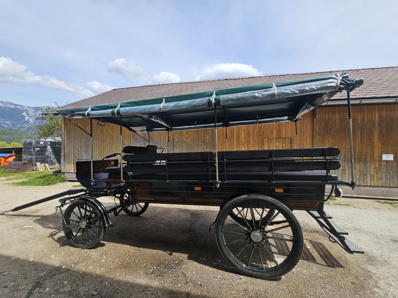 Platz für 12 Personen. Am Kutschbock können 2 Beifahrer mitfahren. Scheibenbremsen voll funktionsfähig, Luftbereifung, Blattfedern, LED Beleuchtung innen, Blinker und Licht vorhanden. Plane vollständig intakt. Dach kann abgenommen werden. Kutschenmasse: Länge 4800 mm, Breite1900, Höhe 2750mm inclusive Plane, Radabstand 1650 mm, Radgröße Hinten 1100 mm, Vorne 850mm, Bockhöhe 1600 mm. Wird wegen zu geringer Nutzung verkauft. Planwagen wurde mit 2 Kaltblüter gefahren.