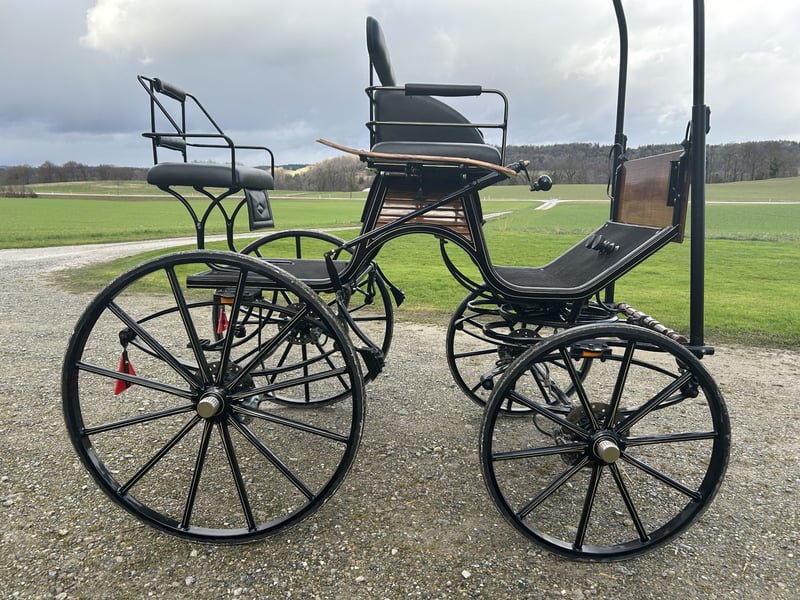 Eleganter, leichter Einspänner Spider, Marke Glinkowski, schwarz lackiert mit goldenen Streifen, gebraucht, aber in sehr gutem Zustand. Kutsche wurde regelmässig professionell gewartet. Spurbreite 138 cm, Räder vorne 80 cm, hinten 100 cm, Scheibenbremsen vorne und hinten, Feststellbremse, manuelle Bremse hinten (Drehkurbel), Teleskoplanden, zus. geschwungene Holzlanden, Fahrersitz verschiebbar (3 Teile). Preis verhandelbar. Abholung durch Käufer.