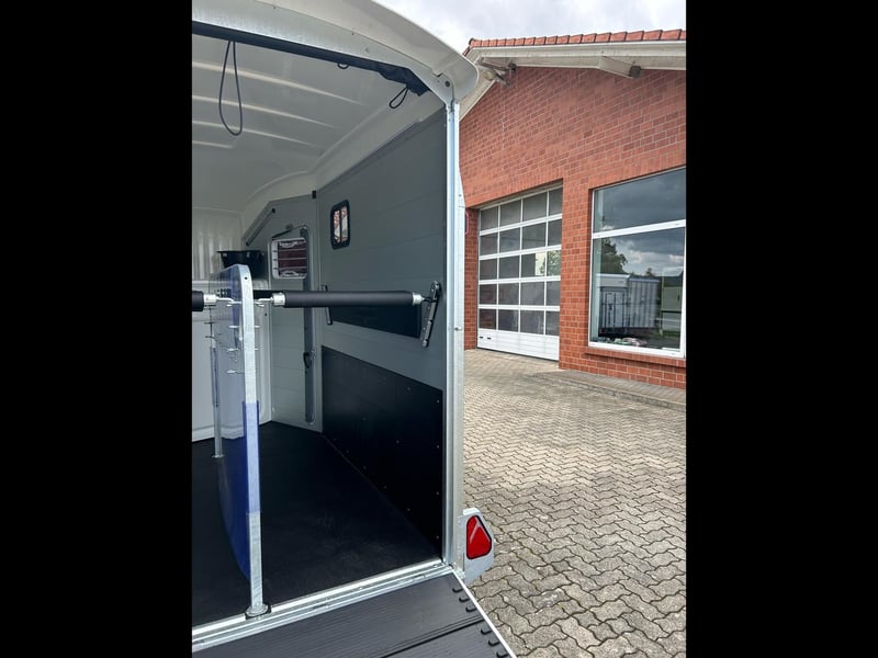 Humbaur Areion Pro 2700 Pferdeanhänger PKW Anhänger Alter: Neu (Produktionsjahr: 2025) 2 Jahre Hauptuntersuchung ab dem Tag der Erstzulassung Inkl. Zulassungspapiere (Kfz-Brief / Zulassungsbescheinigung Teil 2 und COC) Verfügbar ab: Sofort (auf Lager)! Finanzierung über unsere Partnerbanken möglich! Technische Daten Zulässiges Gesamtgewicht: 2.700kg Leergewicht: ca. 1.049kg Nutzlast: ca. 1.651kg Achsenanzahl: 2 Laderaumlänge: 3.538mm Laderaumbreite: 1.703mm Laderaumhöhe: 2.400mm Bremsenart: Gebremst, Auflaufbremse Fahrgestell: Tieflader (Räder neben Aufbau), Gummifederachsen Elektrik: 12V, 13 poliger Stecker Reifengröße: 195/65 R15 Sonderausstattung Ohne Serienausstattung Hecktüre dreh- und schwenkbar Abschließbare Sattelkammer mit ausziehbarem Sattelhalter, Trensenhalter, Spiegel, Netz, Innenbeleuchtung, Schaufel und Besen Seitenpolsterung links und rechts Verschleißmatte vorne EquiDrive® Fahrwerk inkl. Radstoßdämpfer (100 km/h-Zulassung) Alu-BiComp-Boden 21mm (kein Holz - unverrottbar) Gummiboden 8mm stark Seitentrittschutz Aufbau aus doppelwandigen, eloxierten Aluminiumprofilen Poly-Bug im aerodynimschen Rippendesign LED-Beleuchtung Mannshohe Einstiegstür mit 3-Punkt-Verriegelung Extralange Auflaufklappe mit Trittleistengummi Geteilte und höhenverstellbare Brust- und Heckstangen mit EquiGuard® Panikentriegelung EquiLock® verriegelbare Trennwand Getönte Ausstellfenster in Seitenwänden Seitenschiebefenster Polyhaube und Bug in Black Metallic LED-Streifen-Innenbeleuchtung Verstellbare Heunetzhalter Windschott Automatisches Stützrad Rahmen verzinkt V-Deichsel AL-KO oder Knott Achsen und Bremsanlage Zubehör (aufpreispflichtig) Alufelgen Silver / Black Sattelablagestange für 2 Sättel (außen) Schwenkbare Sattelablage für 1 Sattel (außen) Dachfenster Fohlengitter Durchgehende Boxenstange zum Fohlentransport Trittschutzgummi für Sattelkammer Klebedekor (Verschiedene Motive) Kopftrennwand für Mitteltrennwand Sattelkammer mit ausziehbarem Sattelhalter Western mit Sattelhalter, Trensenhalter, Spiegel, Netz, Innenbeleuchtung, Schaufel und Besen Planenrollo PVC anstatt Windschott (Schwarz oder Silber) Polyhaube und Bug in Farbe Verschleißmatte vorne Verschleißmatte hinten Konturmarkierung Areion Anhängerschloss Reserverad 195/65 R15 inkl. Reserveradhalter Fahrzeuganlieferung deutschlandweit Zulassung deutschlandweit Überführungskennzeichen (5 Tage gültig) Hinweis Gewichtsangaben können je nach Ausstattung abweichen; Irrtümer, Zwischenverkauf und Änderungen vorbehalten!