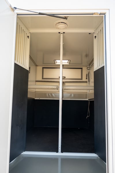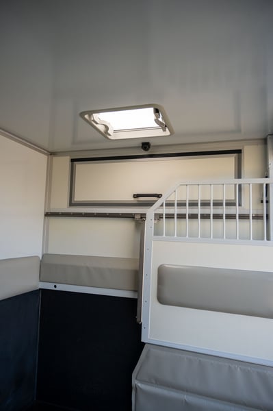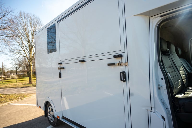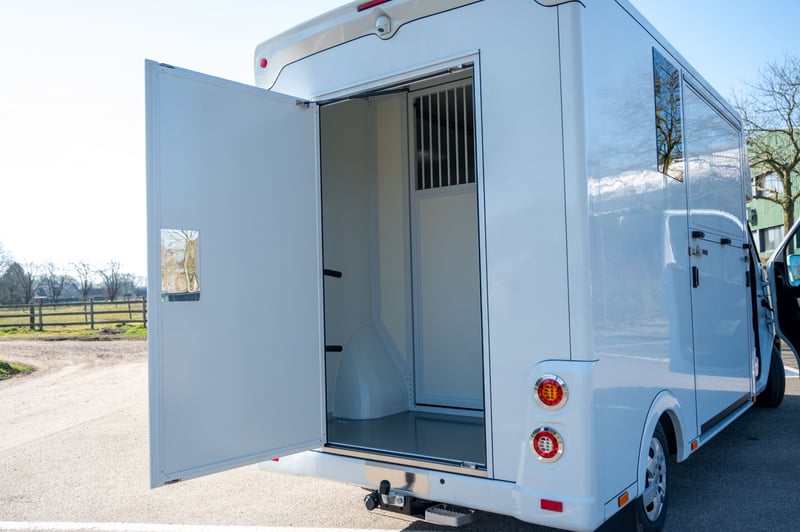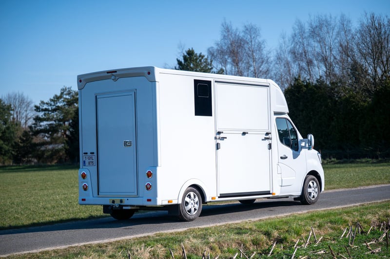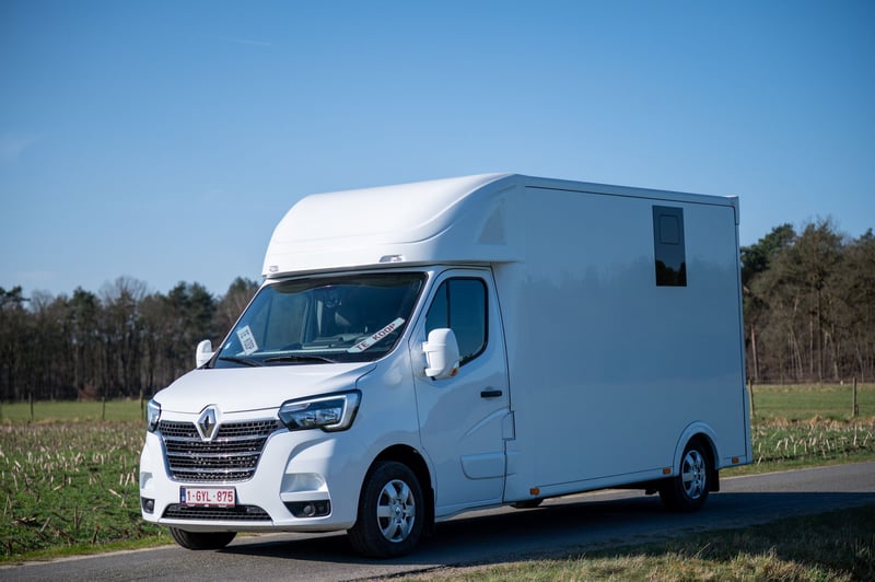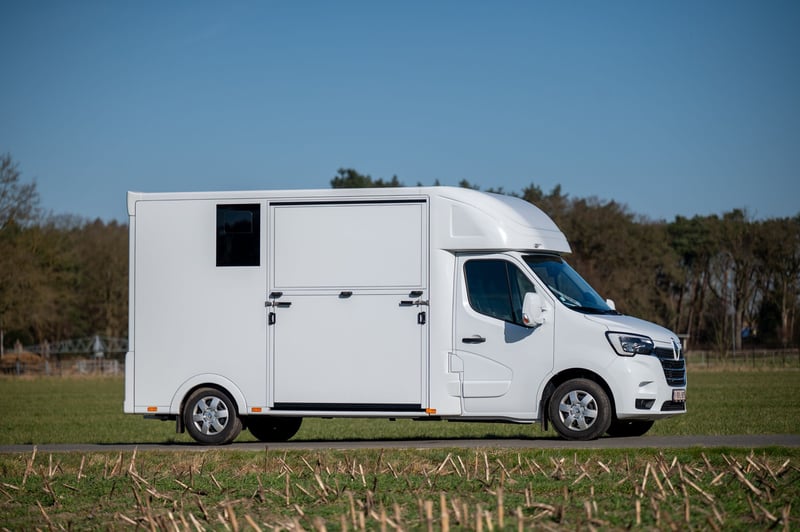 Nieuwe Ultra-light 2 paards Renault Master paardenwagen geschikt voor rijbewijs B met 1100kg laadvermogen. Uitvoering: Renault Grand Master Confort (L3), in mineraal wit, interieur aankleding in donker carbon, stoffen bekleiding "Kaleido", radiatorrosster in chroom afwerking, airco, DAB-radio, bestuurderszetel met armsteun en verstelbare lendensteun. Opbouw in hengstenuitvoering, verschuifbare tussenwand, klapbare tussendeuren, stootkussens, achteruitrijcamera en camera in laadbaak, LED verlichting laadbak blauw/wit, 2 dakluiken, dakventilator bedienbaar via cabine met temperatuur monitoring, anti-slip vloer met afloop, glas-in-glas design ramen met tralies, trekhaak 2500kg met 13-polige stekkerdoos, opstaptrede, dakspoiler met doorlaad mogelijkheid via laadbak, zijklep met kantelbaar dakluik, achterdeur, 2 zadelsteunen & 2 hoofdstelsteunen. Cruise Control optioneel mogelijk € 800 ex. BTW (in plaats van € 1600 ex. BTW)
