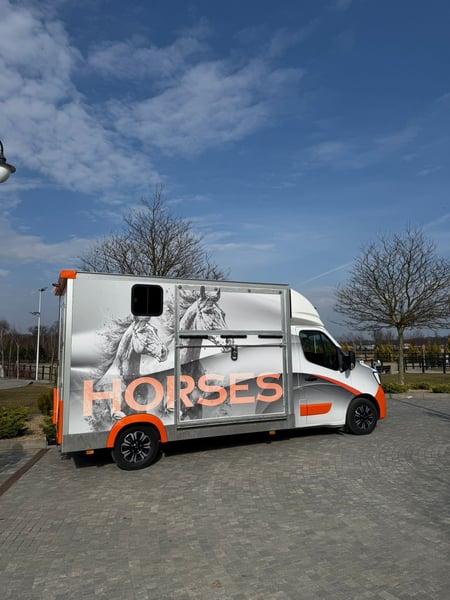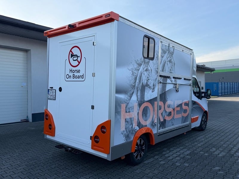 A horse-drawn carriage doesn't have to be boring. This is another project by motostajnia.com. From the very beginning, we focus on durability and reliability — this machine is built to last for many years and hundreds of thousands of kilometers! Year 2023, 81,000 km, 2.3-liter engine with 145 HP. The vehicle has new wheels, full service history, new brakes, air suspension, two cameras (external and internal), and a tow hitch. As a bonus, the set includes a four-wheel trailer with a winch. motostajnia.com emphasizes durability and robustness, combined with original design. The rear doors are 90 cm wide. It features a double-horse box. Warranty on the bodywork is 24 months. Price including VAT (23%). The horse-drawn carriage is parked in Gliwice. Soon, you'll see our advertising campaign — stay tuned! Contact: +48 668 11 33 55.
