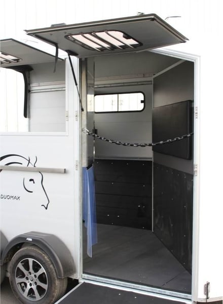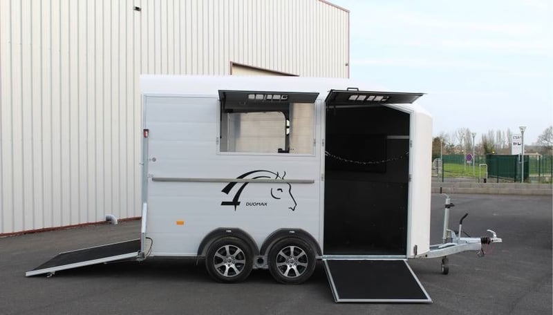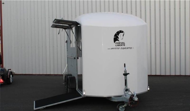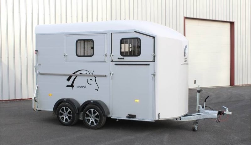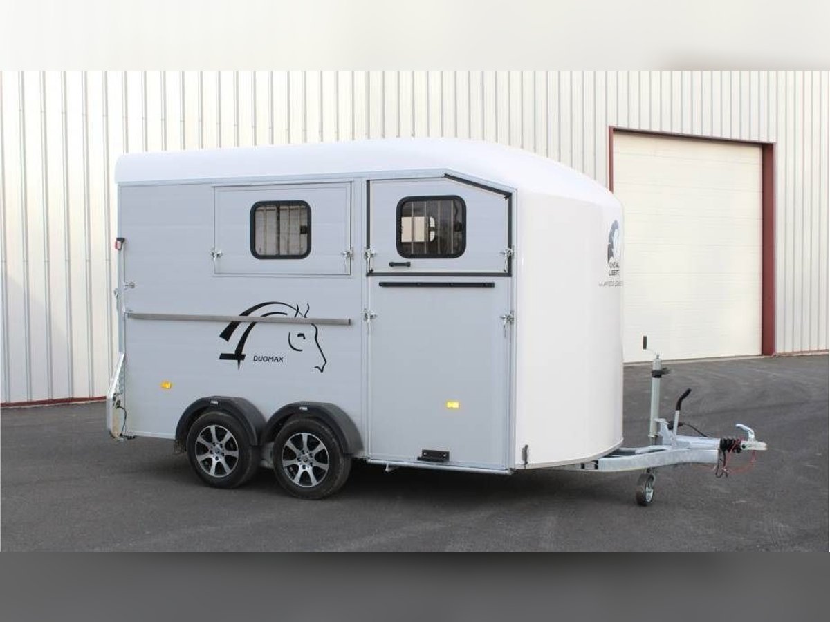 VAN DUOMAX CHEVAL LIBERTE 2 PLACES DIAGONAL Au choix lors de la commande : – Séparation étalon OU – Séparation télescopique Equipement de série : • Châssis suspension Pullman 2 • Plancher aluminium • Parois aluminium anodisées • Sortie pont avant avec volet supérieur, fenêtres coulissante 400×500 intégrée avec barreaux de protection inox • Volet latéral avec fenêtres coulissante 400×500 intégrée avec barreaux de protection inox. • Fenêtre supplémentaire coulissante de ventilation 800×250 côté gauche. • Pont/porte arrière, bâche à enrouleur automatique ventilée. • Vaste compartiment sellerie avec grande porte d’accès intégrant une fenêtre de ventilation 300×400. • Double porte selle sur rail coulissant, porte filets et porte brides, porte document, miroir de courtoisie, éclairage. • Barre d’attache latérale en inox, à droite. • Roue de secours (installée dans la sellerie). • Roue jockey automatique escamotable, poignée de manoeuvre. • Roues jantes métal 185/65R14 • Ailes antichocs. • Séparation demi bat flanc aluminium avec séparation de tête, fermeture par sangle cuir. Barre de recul. • Disponible en plusieurs coloris : Blanc /gris silver / gris anthracite / rouge / noir • Longueur extérieure : 5,03 m • Largeur extérieure : 2,29 m • Longueur intérieure : 3,78 m • Largeur intérieure : 1,81 m • Poids à vide : 960 kg • PTAC : au choix 1400 à 2600 kg Options, montée à l’usine : Séparation sup. télescopique ou étalon (CZ000778) : 960 € Options : 2ème barre d’attache latérale en inox (CZ000436) : 319 € Hayon blanc arrière au-dessus du pont (CZ000518) : 500 € Jantes alu (PTAC max. 2500 kg) (JANTESALU14X4) : 690 € 3 sur tapis caoutchouc 1 x 2 m (CZ000032) : 480 € Barre d’éloignement (BARREELOIGNEMENT) : 420 € Caméra WIFI (CAMERA) : 220 € Antivol de tête (6775) : 47 €