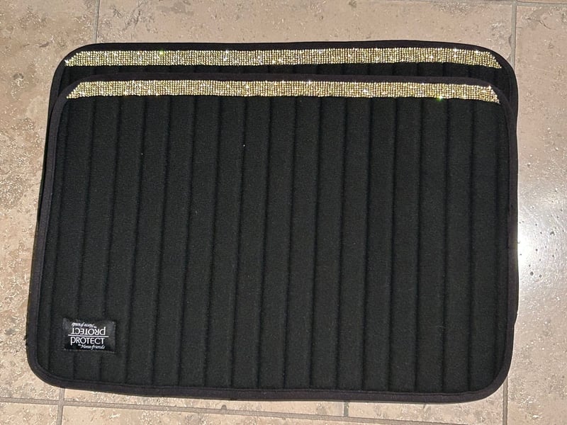 Die PROTECT by Horse-friends Bandagierunterlagen sind längs gesteppte Unterlagen zum Schutz der Pferdebeine. Die dicke Steppung schützt effektiv vor Schlägen, polstert weich ab und schmiegt sich gut an das Pferdebein an. Sie behalten Ihre Form auch nach vielen Wäschen bei 30 Grad bei. Das Strassband ist aus zwei Arten von Diamanten. Auf der Vorderseite- und Rückseite sind Diamanten eingelegt und funkeln in der Sonne und im Licht schön zart, was ein absoluter Blickfang ist. Obermaterial: 100 % Polyester Wattierung: 100 % Polyurethan Farbe: Schwarz Strassband: Glas-Strasssteine in Gold 1,8 cm breit Größe: 30 x 45 cm Lagerbestand: 2 Sets