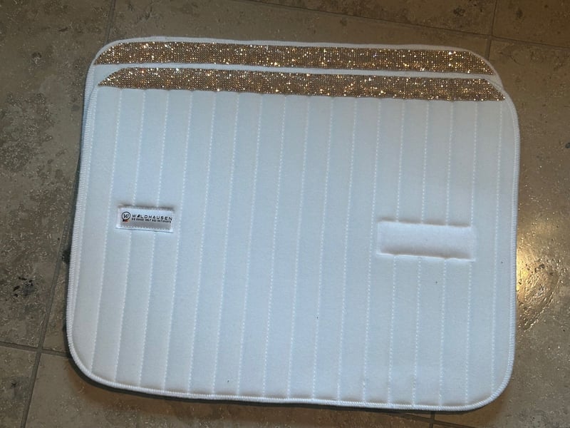 Die schaumgepolsterten Bandagenunterlagen mit Klettverschluss von Waldhausen sind optimal zum mühelosen Anlegen geeignet. Weiches Frottee an der Innenseite sorgt für guten Tragekomfort und ein ausgezeichnetes Klimamanagement. Das Strassband ist aus zwei Arten von Diamanten. Auf der Vorder- und Rückseite sind Diamanten eingelegt, jeder Diamant funkelt in der Sonne und im Licht schön zart, was ein absoluter Blickfang ist. Die Unterlagen sind waschbar bei 30 Grad. Obermaterial: 100 % Baumwolle Füllung: 100 % Polyester Farbe: Weiss Strassband: Glas-Strasssteine in Champagner 2,4 cm breit Größe: 35 x 45 cm Lagerbestand: 5 Sets
