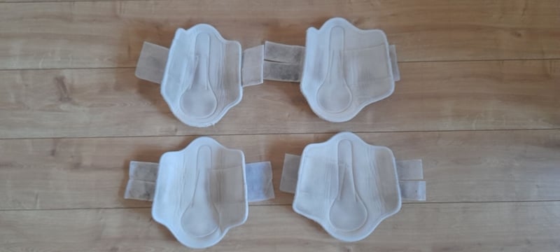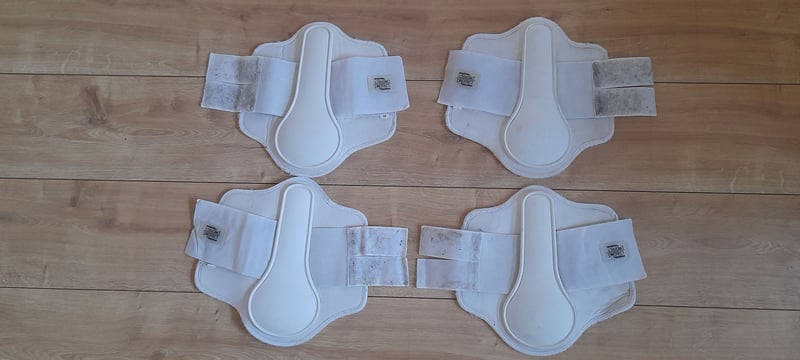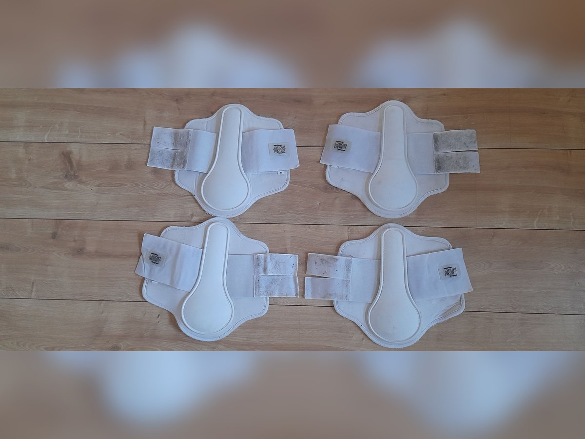 4 weiße Neopren-Gemaschen, sehr gepflegt, gewaschen und desinfiziert, geringe Gebrauchsspuren. Marke Horse Friends, 2 x M, 2 x L. Der Preis bezieht sich auf ein Paar,