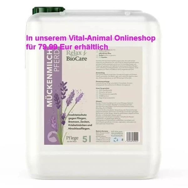 Weitere Tierpflegeprodukte und Ergänzungsfuttermittel auch für Hunde und Katzen, findest du auch hier: 👉 https://vital-animal.de Relax Biocare Mückenmilch – 5‑Liter‑Kanister (MHD 2027) Neu, ungeöffnet und sofort versandbereit. Die Relax Biocare Mückenmilch ist ein bewährtes Mittel zur Abwehr von Mücken, Bremsen und anderen Insekten. Ideal für Pferde, Hunde und Stallumgebung. Die 5‑Liter‑Großpackung ist besonders preiswert und eignet sich perfekt für Ställe, Reitbetriebe und Tierhalter, die regelmäßig nachfüllen. Vorteile der Relax Biocare Mückenmilch: zuverlässiger Schutz vor Mücken & Stechinsekten hautfreundliche Rezeptur ergiebig und sparsam im Verbrauch frisches MHD 2027 Neuware, original verschlossen Preis: 79,99 € Versand möglich oder Abholung nach Absprache. Weitere Tierpflegeprodukte und Ergänzungsfuttermittel auch für Hunde und Katzen, findest du auch hier: 👉 https://vital-animal.de