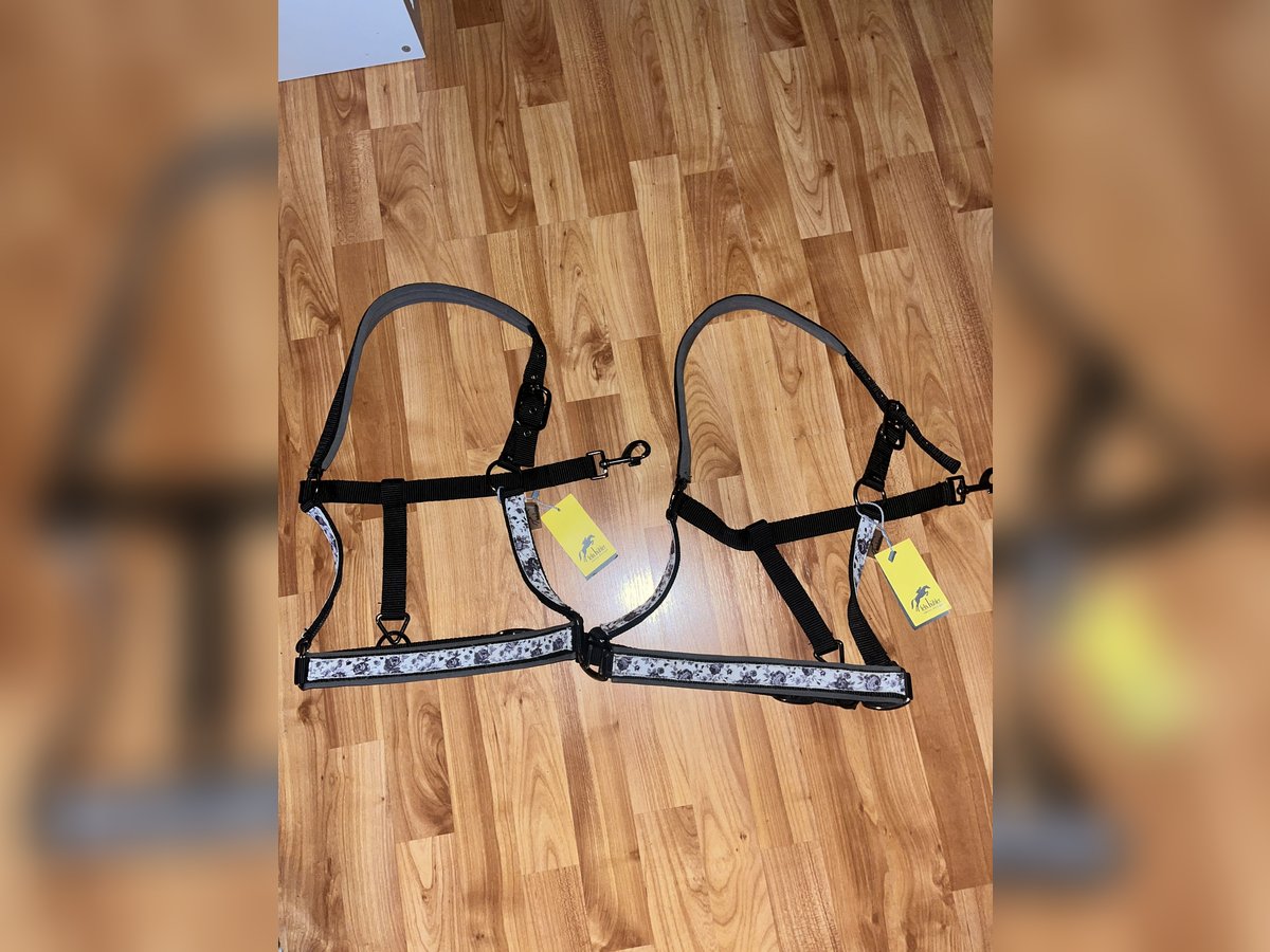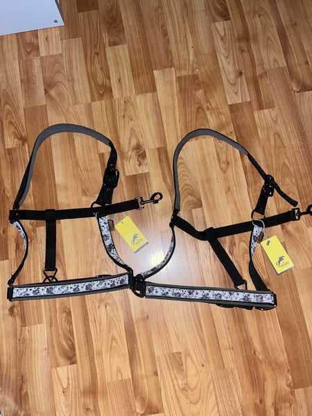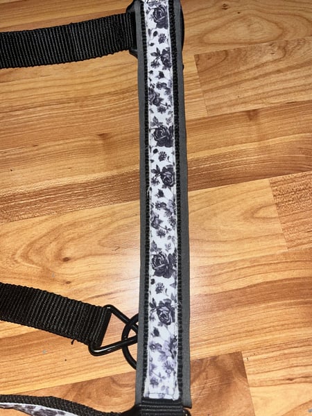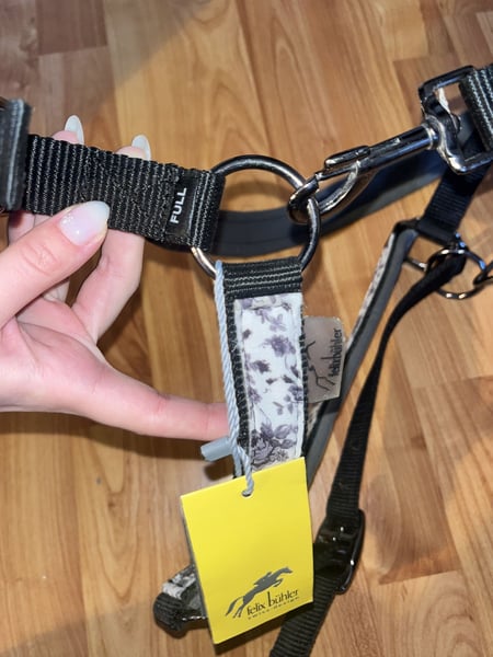 Zwei Felix Bühler Halfter in Full. Die Schnallen sind in dunklem Schwarz, der Nasenriemen und die Seiten sind mit Blumenmuster. 13€ pro Halfter. Versand möglich.