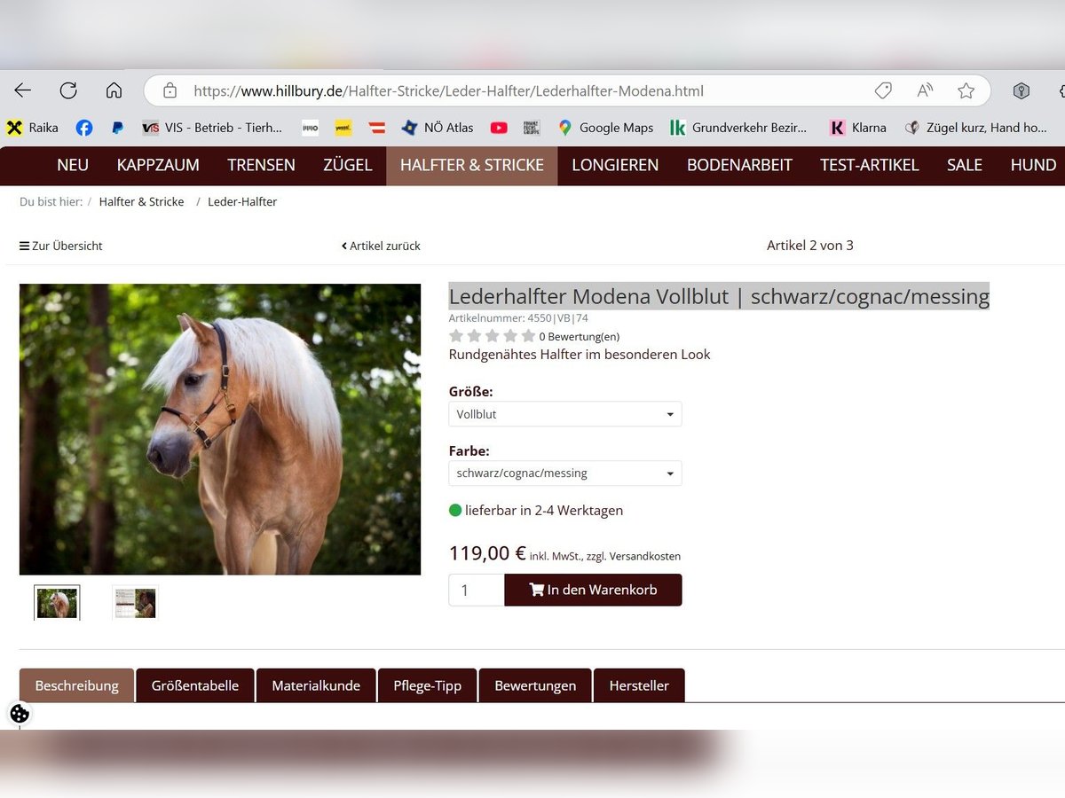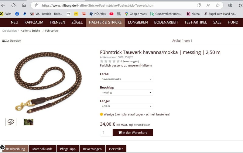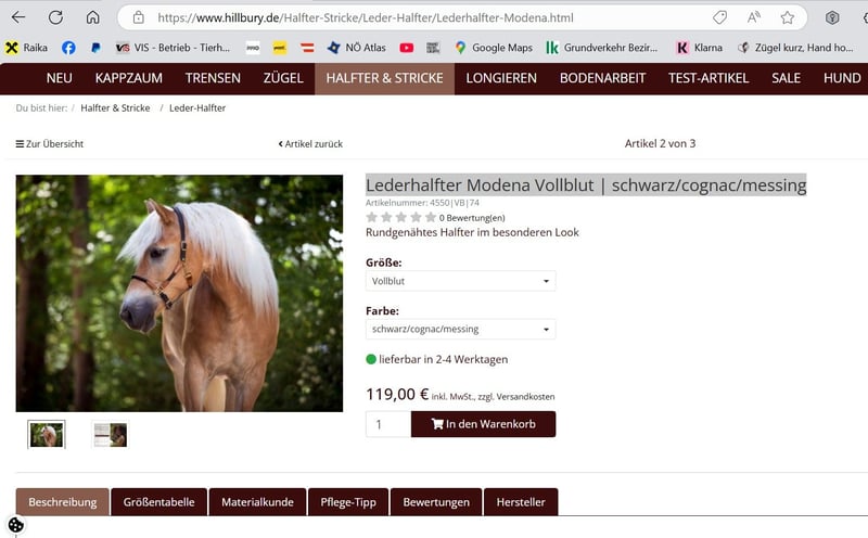 Beschreibung Hillbury Lederhalfter Modena Vollblut | schwarz/cognac/messing Lederhalfter mit weichem Nasenriemen 119,- Lederhalfter Modena Vollblut | schwarz/cognac/messing Halfter zusammen mit dem Führstrick, beides funkelnagelneu mit Etikett 119- ZUSAMMEN!! Das Lederhalfter Modena überzeugt mit schlichter Eleganz. Die dezenten Farbkombinationen aus tiefschwarzen und braunen Leder-Komponenten passen hervorragend zu jeder Fellfarbe. Rundgenähtes Pferdehalfter in geschmackvollen Farbkombinationen Der Materialmix aus weichem, pflanzlich gegerbtem Rindsleder und rundgenähtem Elch- oder Nubukleder sieht nicht nur gut aus, sondern ist zudem besonders fellschonend. Aber auch alle anderen Materialien des Hillbury Halfters können sich sehen lassen: Beschläge aus zart glänzendem Messing und Nähte aus echtem englischem Sattlergarn. Lederhalfter mit anatomischem Genickstück und individueller Passform Für das Wohlbefinden Deines Pferdes ist das Genickstück anatomisch geformt und mit handschuhweichem Elchleder unterfüttert. Die Passform kann individuell eingestellt werden: Dafür ist das Leder-Halfter am Genickriemen sowie am Nasenriemen beidseitig verstellbar. Einen passenden Führstrick kannst Du hier dazu bestellen: Tauwerk-Führstrick Deine Vorteile im Überblick Individuell anpassbar: beidseitig am Genickstück sowie am Nasenriemen Flacher Karabiner zur Schonung des Kaumuskels Fester Führring für eine einfache Handhabung Pflanzlich gegerbtes Rindsleder Weiches Elchleder- oder Nubukleder Und Führstrick aus feinem Segeltau 39,- Dieser Führstrick aus schimmerndem Segelseil ist nicht nur angenehm leicht, sondern auch bestechend schön. Er passt perfekt zu den eleganten Hillbury Tauwerk-Halftern. Das softe, zart schimmernde Polyestergarn vereint gleich mehrere positive Besonderheiten: Es liegt weich in der Hand, ist äußerst langlebig und hinterlässt bei einem jungen Wildfang keine brennenden Spuren in der Hand. Leichter Führstrick aus robustem Seilmaterial Dieser Führstrick ist so fein und leicht, dass Dein Pferd wie in Freiheit neben Dir läuft. Auf diese spielerische Art und Weise lernt es in Deiner Nähe zu bleiben, ohne dabei „geführt“ zu werden. Über kurz oder lang steht damit einem gemeinsamem Weg zur Koppel, auch ohne Seil, nichts mehr im Wege. Robuste Edelstahl- bzw. Messing-Karabiner und eine kleine Lederklatsche aus feinem Rindsleder komplettieren das Design. Maße: Durchmesser 11 mm, Länge wahlweise 2,00 m oder 2,50 m Verwendung: Führstrick, Anbindeseil, aber auch zur Vorbereitung der Freiarbeit Deine Vorteile im Überblick Besonders weich in der Hand Wasserabweisendes und abriebfestes Segeltau Seil aus deutscher Herstellung Sorgfältige Handarbeit aus unserer Sattlerei
