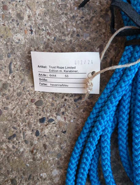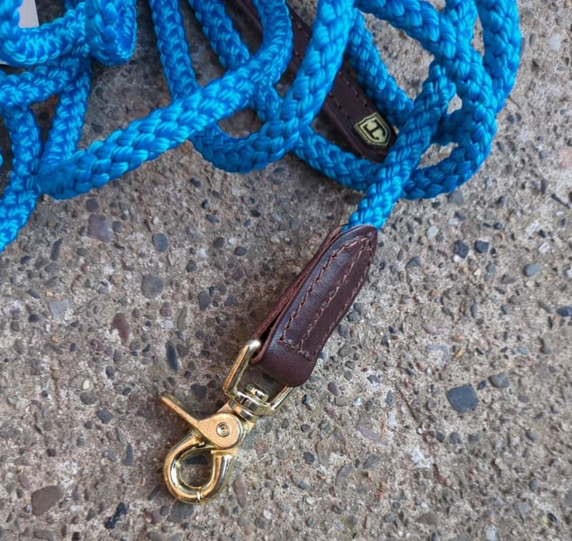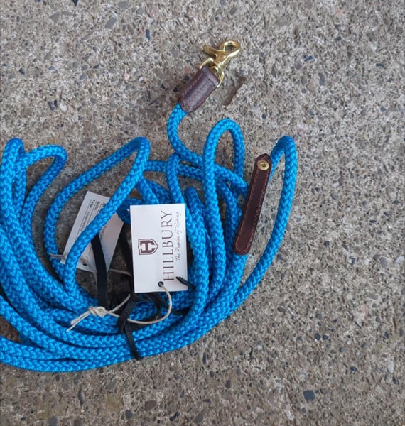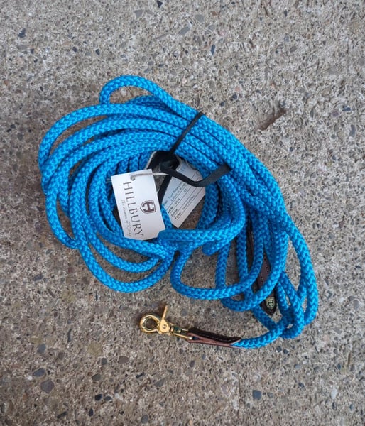 Wunderschönes Hillbury Trust Rope in Sonderfarbe türkis mit braunem Leder und Messinghaken, 7m lang (Farbe intensiv türkis, auf den Fotos leider nicht darstellbar). Auch ideal als Longe oder Bodenarbeitsseil für Shettys und andere kleine Ponys, da es sehr leicht ist und einen kleinen Haken hat.