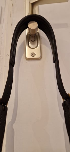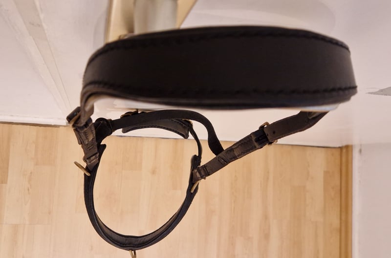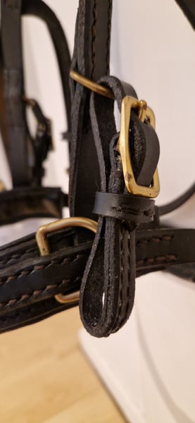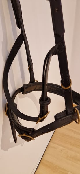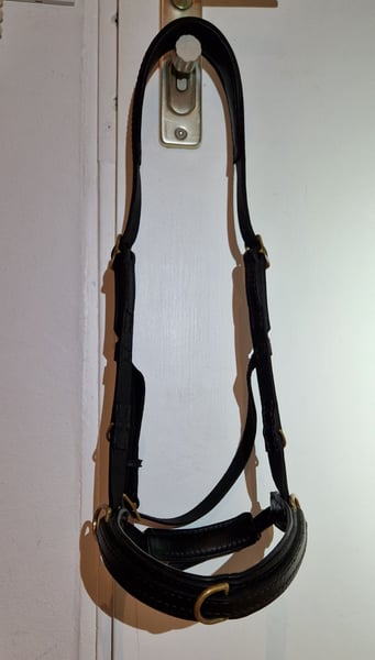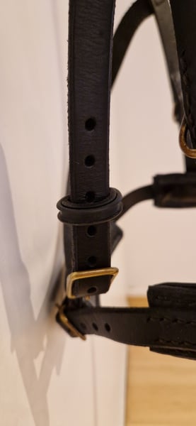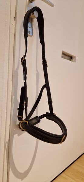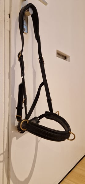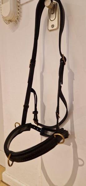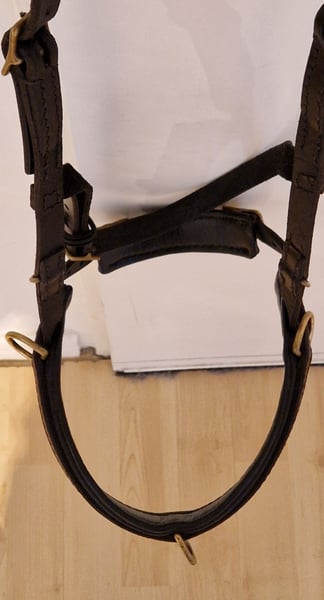 Zum Verkauf steht ein älterer, aber selten benutzter Kappzaum aus Leder ohne Naseneisen in Größe WB. Das Nasen- und Genickstück ist weich unterfüttert und schmiegt sich sehr gut an die Kopfform an. Der Zaum war eigentlich dunkelbraun, wurde von mir aber vor einiger Zeit schwarz eingefärbt. Die beiden äußeren Ringe auf dem Nasenstück sitzen deutlich weiter außen als bei anderen Kappzäumen, weshalb sich der Zaum auch sehr gut als gebisslose Trense (Sidepull) oder für die Handarbeit eignet. Sicher auch für den Longenunterricht mit Kindern ideal (Zügel und Longe gleichzeitig einschnallbar). Zusätzlich gehören aber auch Gebissriemchen zum Zaum, sodass man theoretisch auch mit Gebiss longieren könnte oder mit 2 Zügelpaaren arbeiten kann. Diese sind noch komplett neu, weil ich sie nie verwendet habe. Einer der Schlaufen zum Wegstecken des Riemenendes ist aufgegangen. Ich habe einfach ein Mähnengummi drüber gezogen, wie auf Bild 8 zu sehen. Aber jeder Schuster oder Sattler könnte die Stelle auch mit wenigen Stichen nähen.