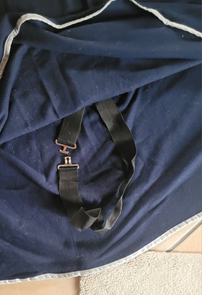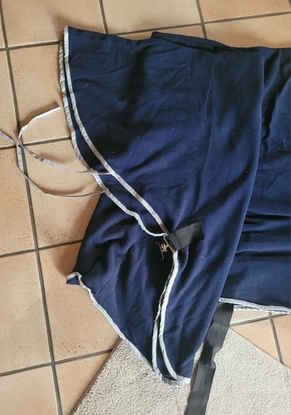 Sie bieten hier auf eine gebrauchte leichte blaue Fleece Abschwitzdecke mit Halsteil in der Größe 155 cm Die Decke ist umrandet mit einem silber reflektierendem Leuchtstreifen Schweifriemen / Bauchgurt inneliegend / Halsriemen