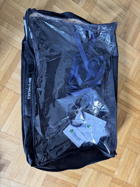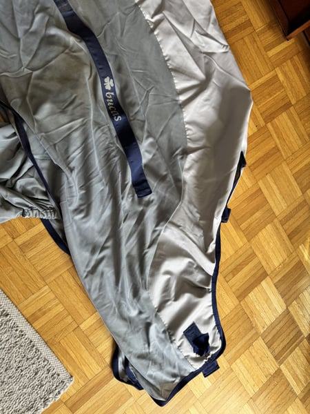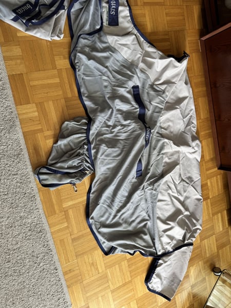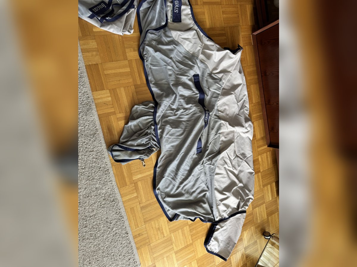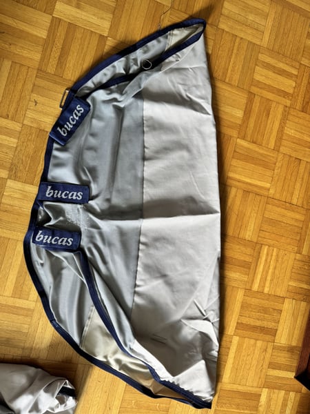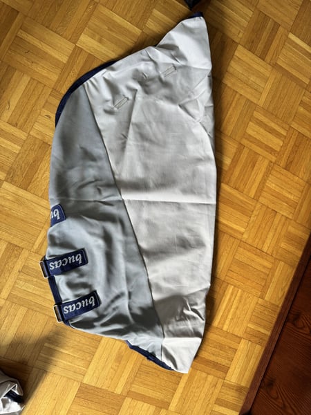Zum Verkauf steht die abgebildete Regenfliegendecke von Bucas. Es handelt sich um das Modell Buzz-Off Rain in 145 cm. Die Decke kommt mit Halsteil, Bauchlatz und Deckentasche und wurde nur einen Saison genutzt. Neuwertiger Zustand. Es fehlt lediglich am Halsteil der dünne Kopfriemen. Versand gegen Kostenübernahme möglich.